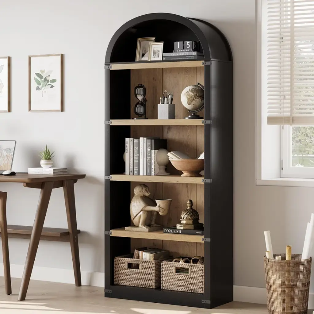 Introducing the 71" Tall Arched Bookshelf, a perfect blend of modern elegance and farmhouse charm designed to elevate any living space. This stunning 5-tier bookcase features a beautifully arched top and rich natural wood grain that adds warmth and character to your home. Enhanced with stylish metal corner protection, it not only exudes rugged beauty but also ensures durability and resistance to everyday wear and tear, making it a timeless addition to rustic, contemporary, or eclectic decor styles.