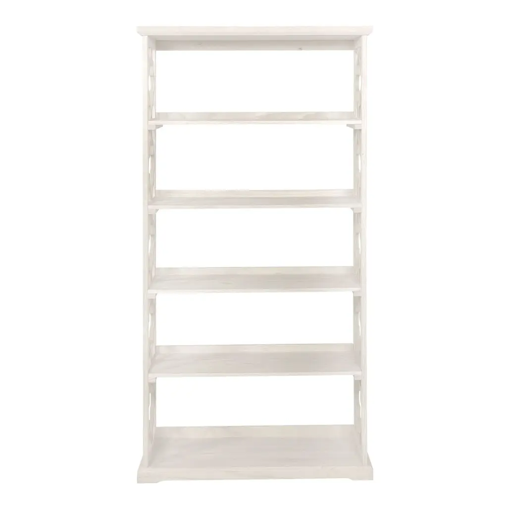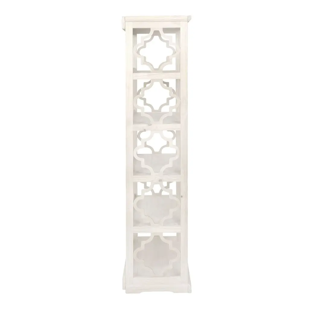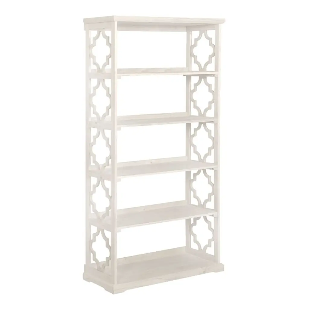 Crafted of pine wood with quatrefoil side cutouts, the tall Abbey bookshelf is a modern storage piece for the living room, home office or bedroom. Five open shelves offer ample space for storing and displaying books, photos and keepsakes. This chic bookcase comes in crisp white to blend perfectly with your existing decor.