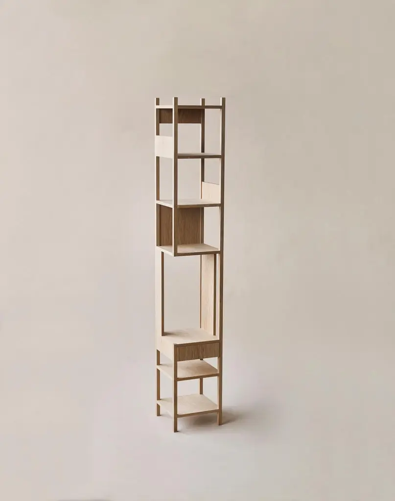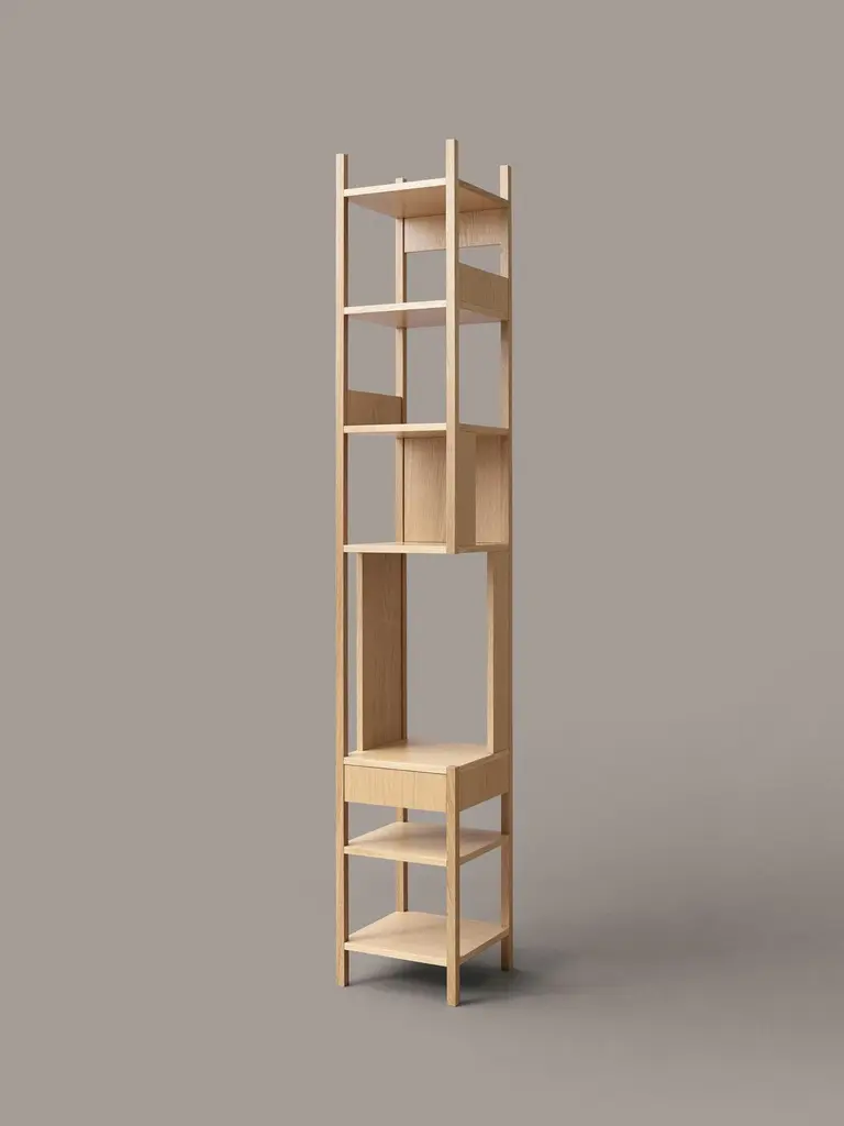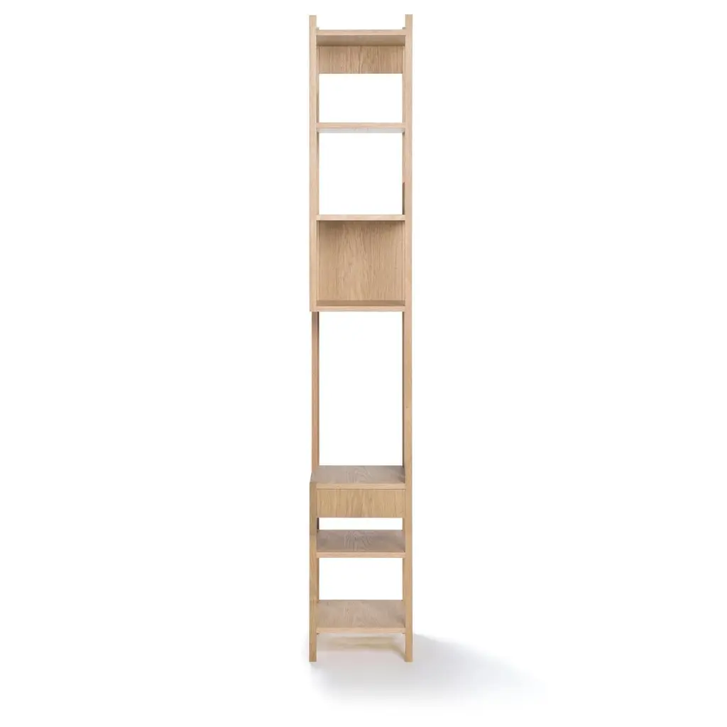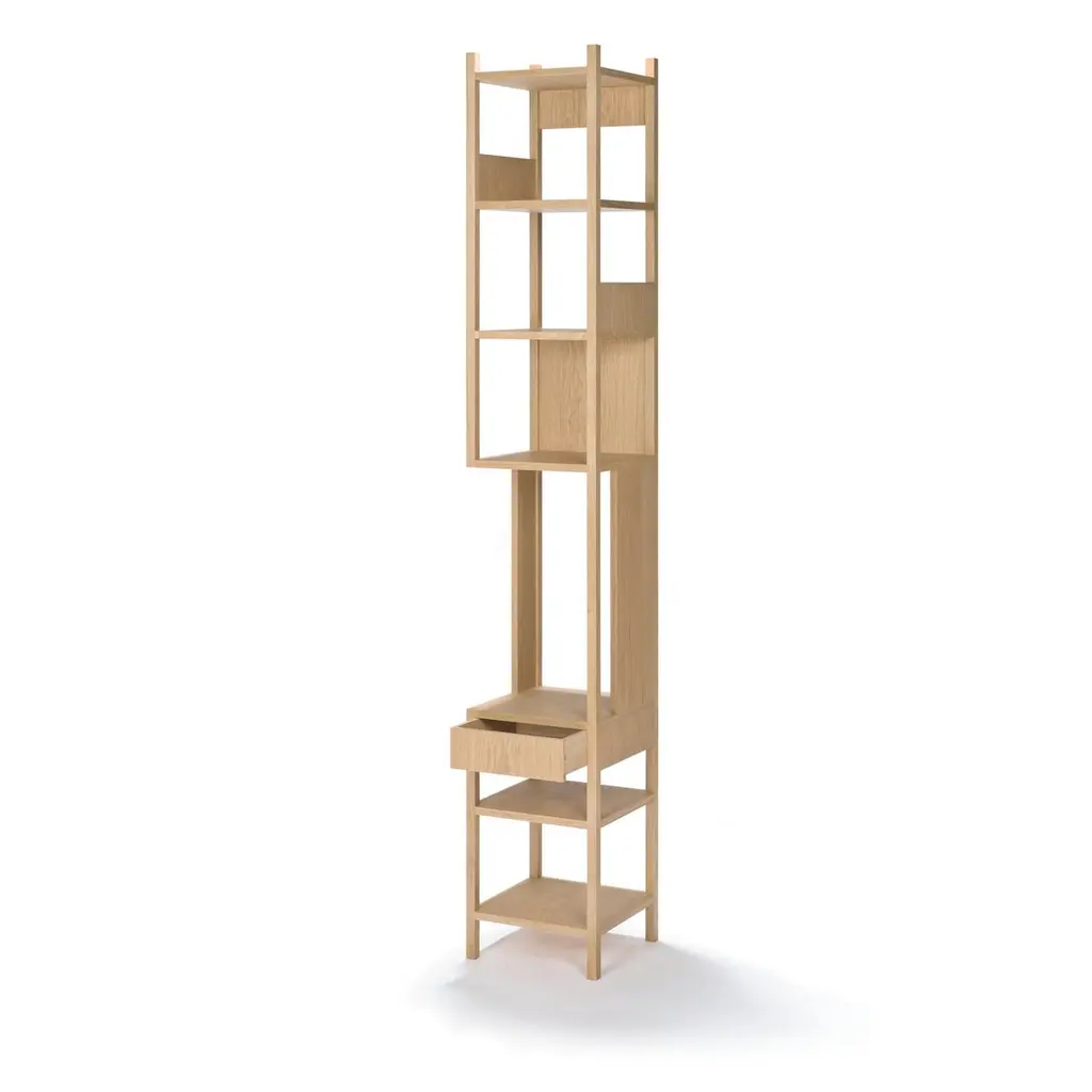 Achille Castiglioni, 1991 Left Handed White Oak Lungangolo For KarakterCastiglioni is said to ponder a lot on lost space. Empty inches and square meters that could be filled with beautiful design—but for some reason just never were. Due to this thinking he did many designs intended specifically for the corners of the home. Lungangolo is one of those. Lungangolo is a multi-use piece of furniture originally produced by Bernini. The frame is made of four slender pillars with square cross-sec-tions in between to support the square shelves placed in various heights. The structure is strengthened by a drawer and a side piece. The position of the drawer and elimination of part of the support meant it had to be manufactured in two versions—to work for both left and right handed."If I have to choose one word about Achille – curiosity. I grew up with a man who was very, very playful. Curiosity is linked to toys, curiosity is linked to other people, other countries, other mentalities. If you are curious you can remain young."Product MaterialSolid and veneered oak treated with natural oil or black oilMeasurementsHeight225 cmWidth36 cmDepth36 cmGeneral specificationsEnviromentIndoorRequires assemblyNoImportant information regarding images of products:Please note that some of the images show other colors and variations of the model, these images are only to present interior design proposals. The item that is selling is on the first image.Important information regarding color(s) of products:Actual colors may vary. This is due to the fact that every computer monitor, laptop, tablet and phone screen has a different capability to display colors and that everyone sees these colors differently. We try to edit our photos to show all of our products as life-like as possible, but please understand the actual color may vary slightly from your monitor About the Design:”I have always desired to do the opposite. Not because I have an anarchic behaviour, but because I think the fundamental basis of design consists in thinking the opposite”. Renowned Italian designer Achille Castiglioni (1918-2002) had a passion for re-designing, re-inventing and re-conceptualizing. Traditional interior design objects would pass through his Milan-based studio and end up perfected. He always aimed at enhancing and glorifying the value of the design. Throughout his career he worked to raise design to an ever-higher level of synthesis - stripping design down to the very core and eliminating everything superfluous. During his career Achille Castiglioni collaborated with many designers, among them Giancarlo Pozzi. Together they made Trio and Comodo in 1991.About the manufacturer:Karakter is a Danish design company founded on a spirit of exploration, courage and an uncompromising attitude to quality. Rooted in the Scandinavian design tradition with an international outlook, Karakter presents a portfolio of furniture, lighting and objects that is relevant, honest, expressive and sometimes playful. Aspiring to build an enduring legacy, they work with contemporary designers such as Aldo Bakker and PlueerSmitt and present works by the masters Bodil Kjær, Achille and Pier Giacomo Castiglioni, Paul McCobb, Joe Colombo and Angelo Mangiarotti. Each piece has a clear, undeniable expression, ensuring it pride of place in private homes and public spaces worldwide.