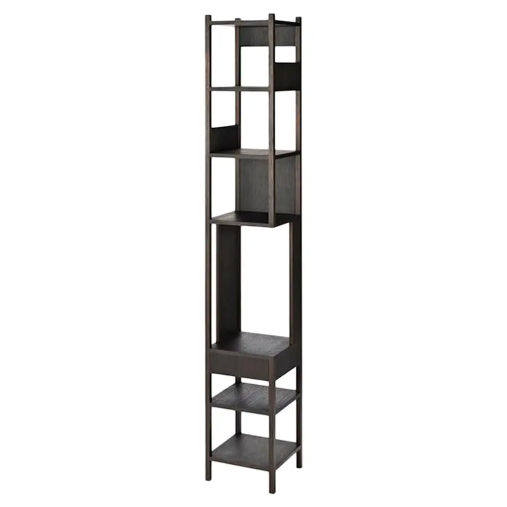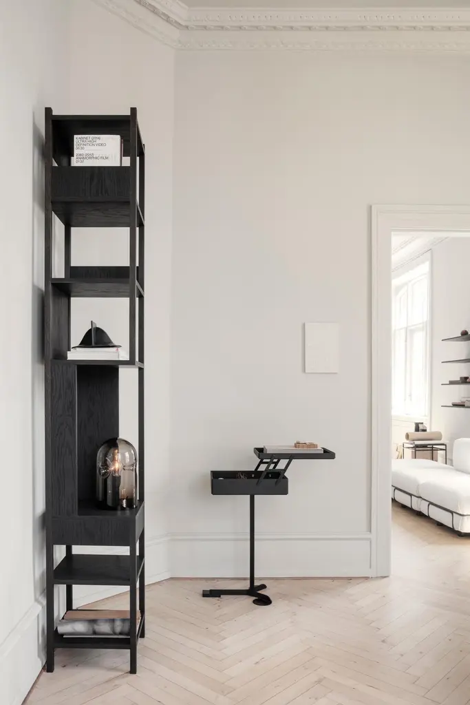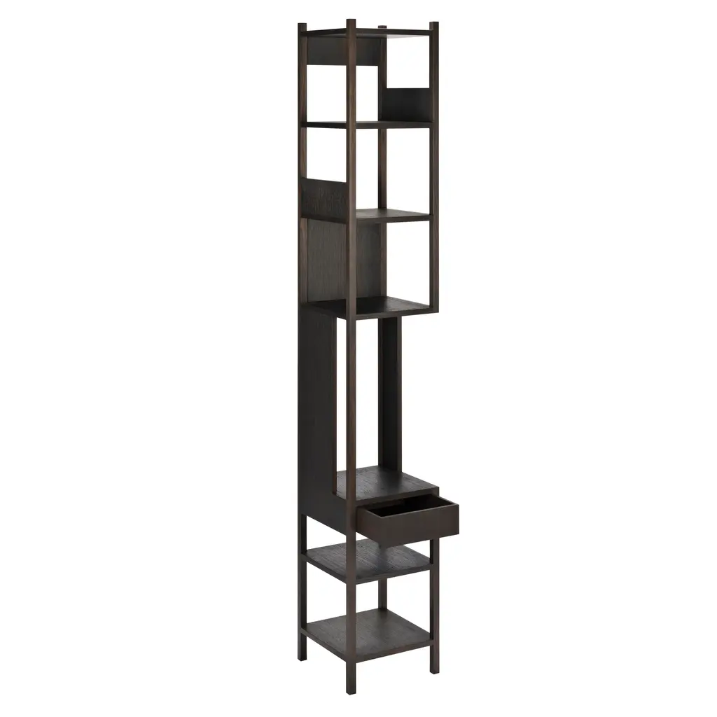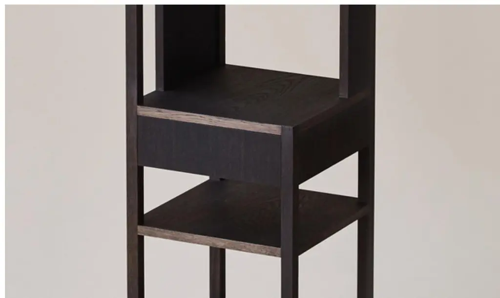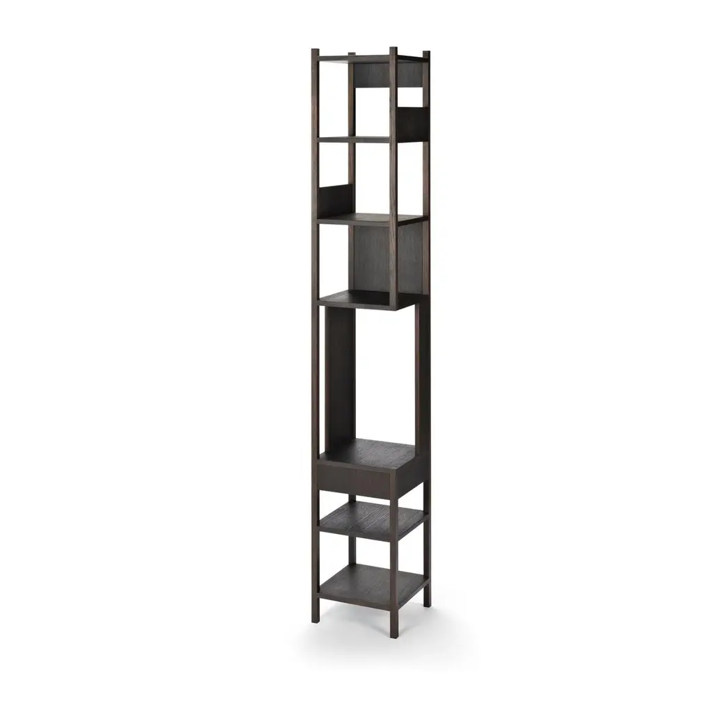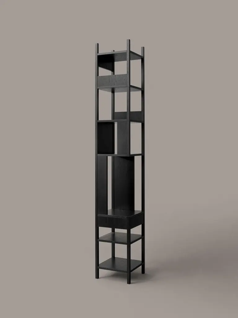 Achille Castiglioni, 1991 Right Handed Black Oiled Oak Lungangolo For KarakterCastiglioni is said to ponder a lot on lost space. Empty inches and square meters that could be filled with beautiful design—but for some reason just never were. Due to this thinking he did many designs intended specifically for the corners of the home. Lungangolo is one of those. Lungangolo is a multi-use piece of furniture originally produced by Bernini. The frame is made of four slender pillars with square cross-sec-tions in between to support the square shelves placed in various heights. The structure is strengthened by a drawer and a side piece. The position of the drawer and elimination of part of the support meant it had to be manufactured in two versions—to work for both left and right handed."If I have to choose one word about Achille – curiosity. I grew up with a man who was very, very playful. Curiosity is linked to toys, curiosity is linked to other people, other countries, other mentalities. If you are curious you can remain young."Product MaterialSolid and veneered oak treated with natural oil or black oilMeasurementsHeight225 cmWidth36 cmDepth36 cmGeneral specificationsEnviromentIndoorRequires assemblyNoImportant information regarding images of products:Please note that some of the images show other colors and variations of the model, these images are only to present interior design proposals. The item that is selling is on the first image.Important information regarding color(s) of products:Actual colors may vary. This is due to the fact that every computer monitor, laptop, tablet and phone screen has a different capability to display colors and that everyone sees these colors differently. We try to edit our photos to show all of our products as life-like as possible, but please understand the actual color may vary slightly from your monitor About the Design:”I have always desired to do the opposite. Not because I have an anarchic behaviour, but because I think the fundamental basis of design consists in thinking the opposite”. Renowned Italian designer Achille Castiglioni (1918-2002) had a passion for re-designing, re-inventing and re-conceptualizing. Traditional interior design objects would pass through his Milan-based studio and end up perfected. He always aimed at enhancing and glorifying the value of the design. Throughout his career he worked to raise design to an ever-higher level of synthesis - stripping design down to the very core and eliminating everything superfluous. During his career Achille Castiglioni collaborated with many designers, among them Giancarlo Pozzi. Together they made Trio and Comodo in 1991.About the manufacturer:Karakter is a Danish design company founded on a spirit of exploration, courage and an uncompromising attitude to quality. Rooted in the Scandinavian design tradition with an international outlook, Karakter presents a portfolio of furniture, lighting and objects that is relevant, honest, expressive and sometimes playful. Aspiring to build an enduring legacy, they work with contemporary designers such as Aldo Bakker and PlueerSmitt and present works by the masters Bodil Kjær, Achille and Pier Giacomo Castiglioni, Paul McCobb, Joe Colombo and Angelo Mangiarotti. Each piece has a clear, undeniable expression, ensuring it pride of place in private homes and public spaces worldwide.