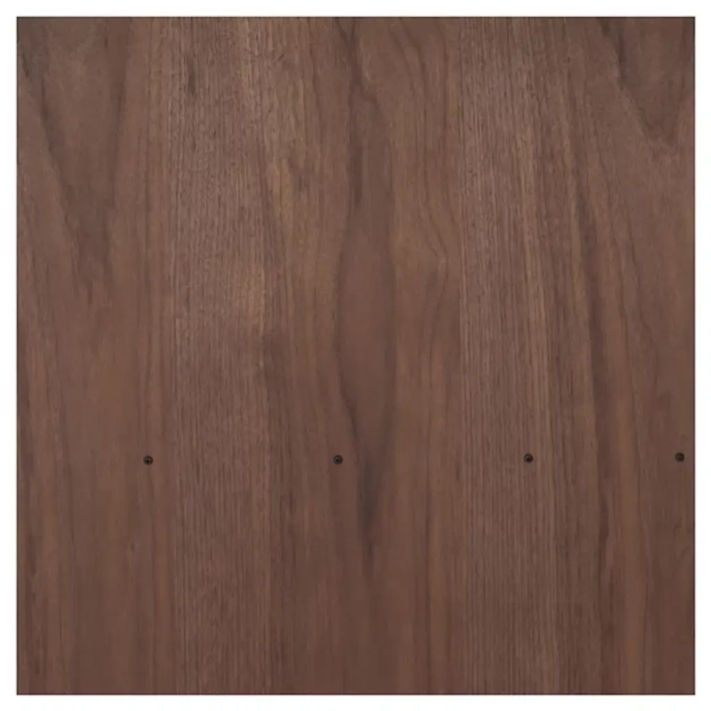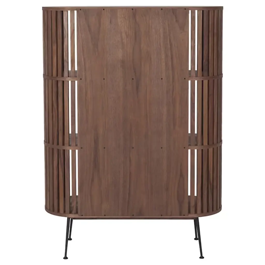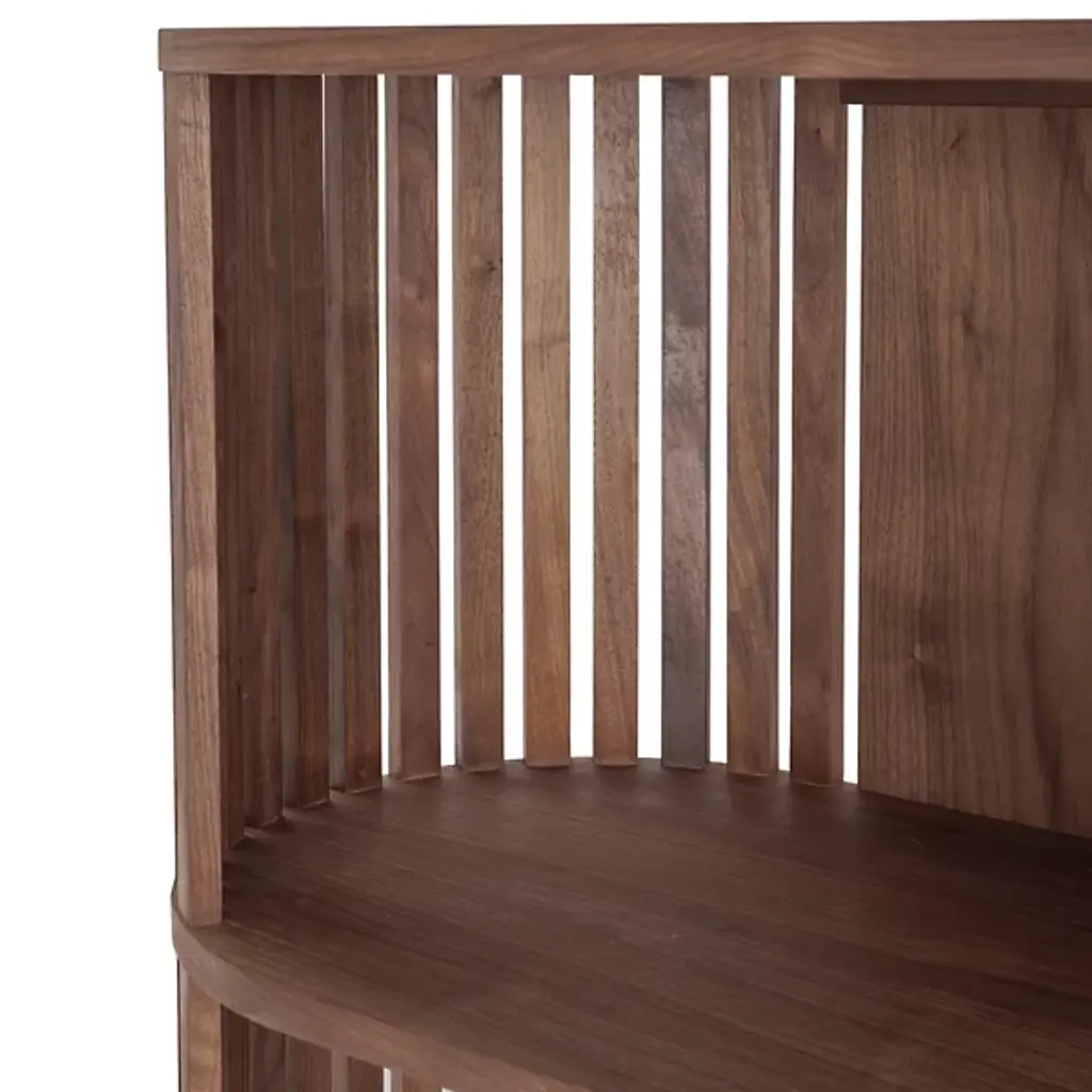 The Adair Bookshelf from Huxe showcases solid walnut construction with walnut veneer shelving in a gently rounded midcentury form. Gated paneling details the sides and back while slightly flared steel legs provide support and visual lift. The deeper shelves accommodate larger books and display items while natural grain variations add individual character. This bookshelf is ideal for living rooms to display book collections, home offices for reference materials, or bedrooms where personal libraries create intimate reading spaces.