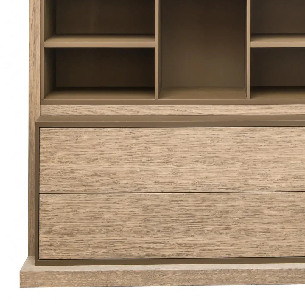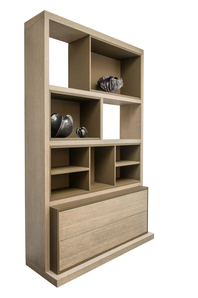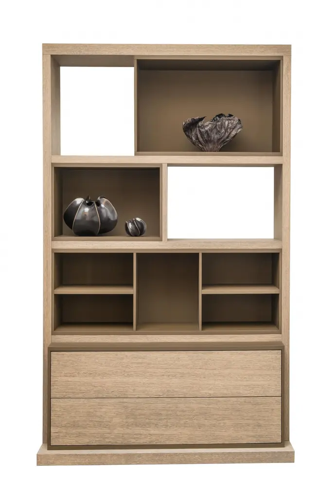 The bookcase is designed by the Atelier Linné collective, with shelves made of oak and the bottom in matte lacquer. It is characterized by both its symmetrical and asymmetrical sides and includes two drawers on the width in the lower part.Atelier Linné is a collective of contemporary designers, artists, and artisans. Founded in 2010 by Anne Jacquemin Sablon, Atelier Linné was born from her experience in art design and her desire to collaborate more with design and art craftsmen, creating new collaborations that combine know-how and creativity. This collaboration with various stakeholders at the junction of design and contemporary art has given life to a rich and long-lasting collection of furniture, lighting, and accessories with clean lines, crafted from noble materials. Atelier Linné aims to promote French craftsmen and workshops where the entire collection is made, allowing customers to acquire tailor-made furniture.