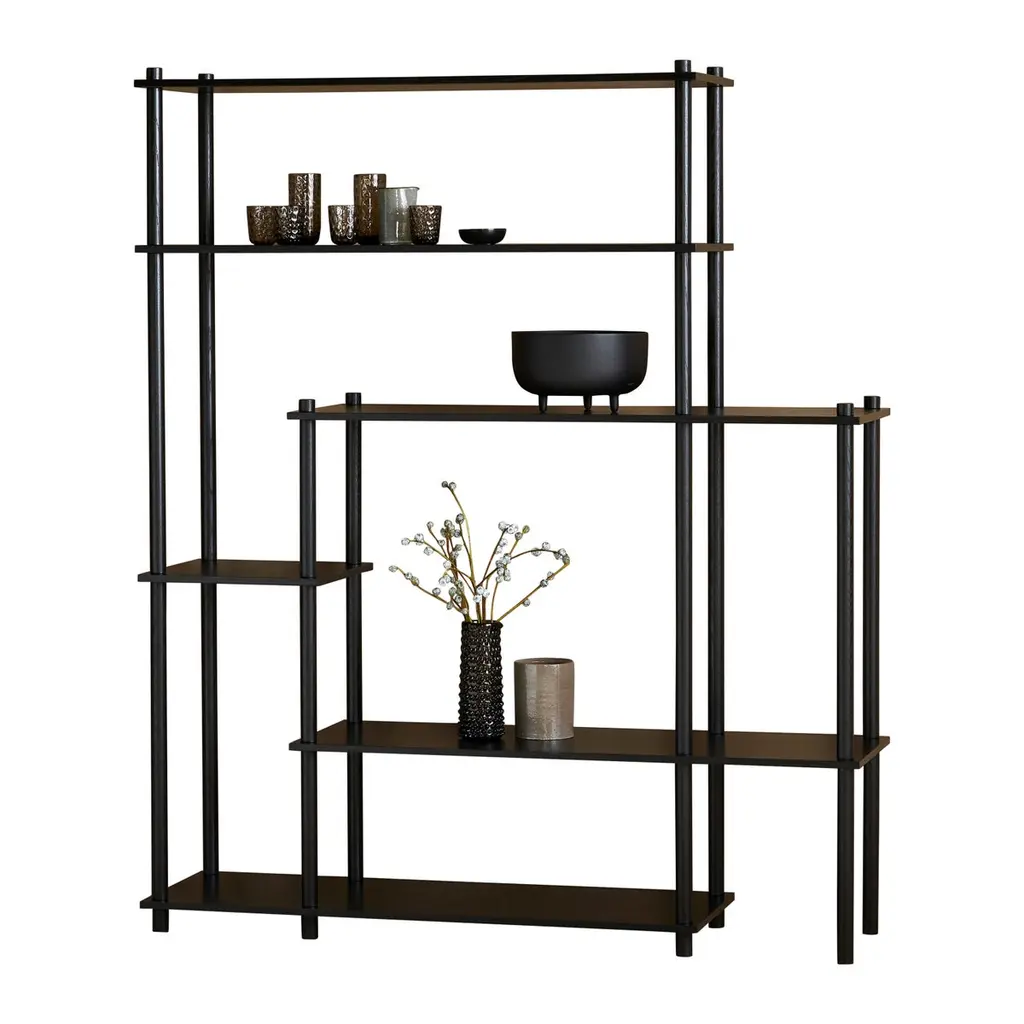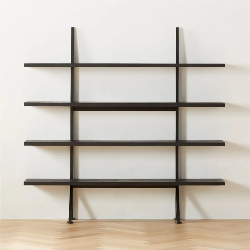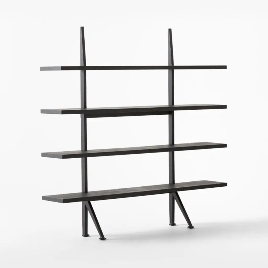 Tall, wide bookcase by Veronica Balutto has the look of a wall-mounted unit, but stands independently on cleverly angled legs. Inspired by classic midcentury shelving, the black sand-cast aluminum frame has an industrial feel. Its four acacia shelves are heavily wire brushed and finished to resemble charred wood in all its richness. CB2 exclusive.