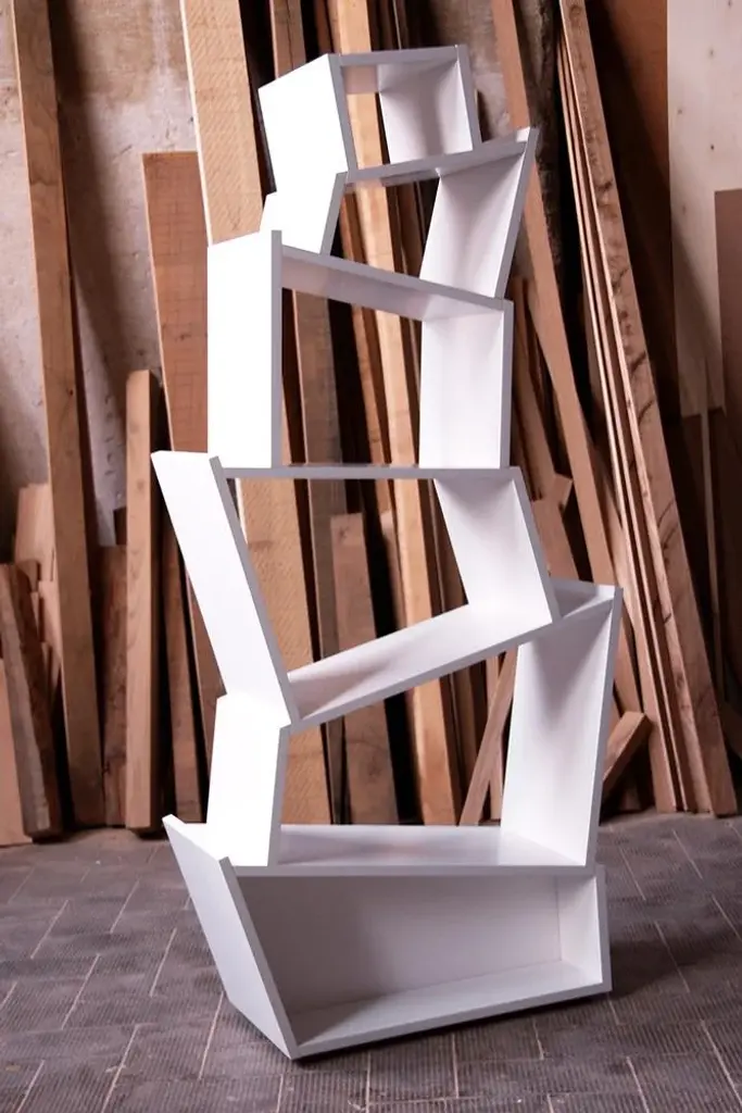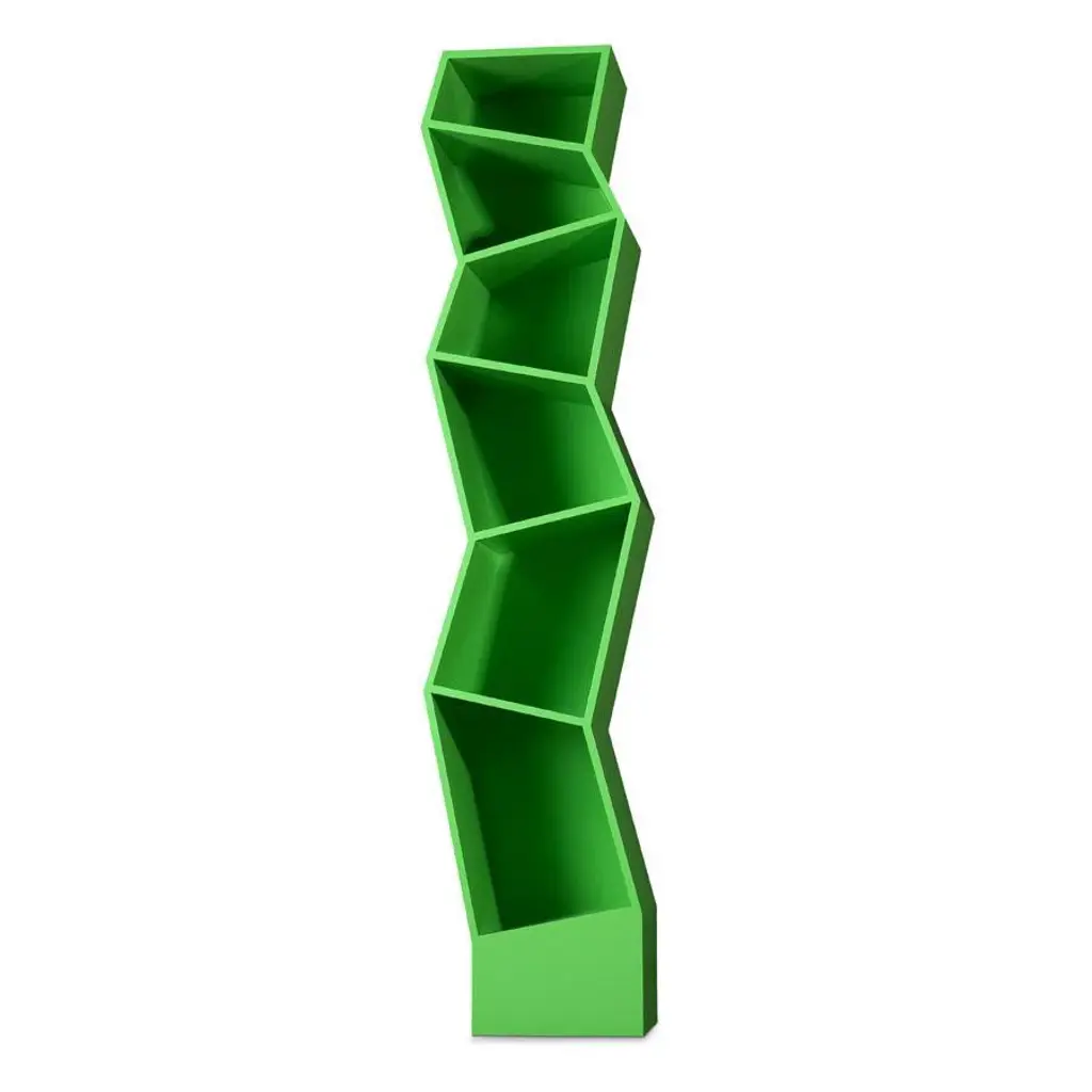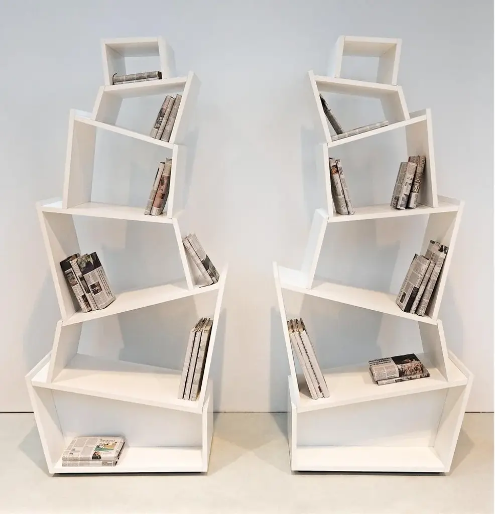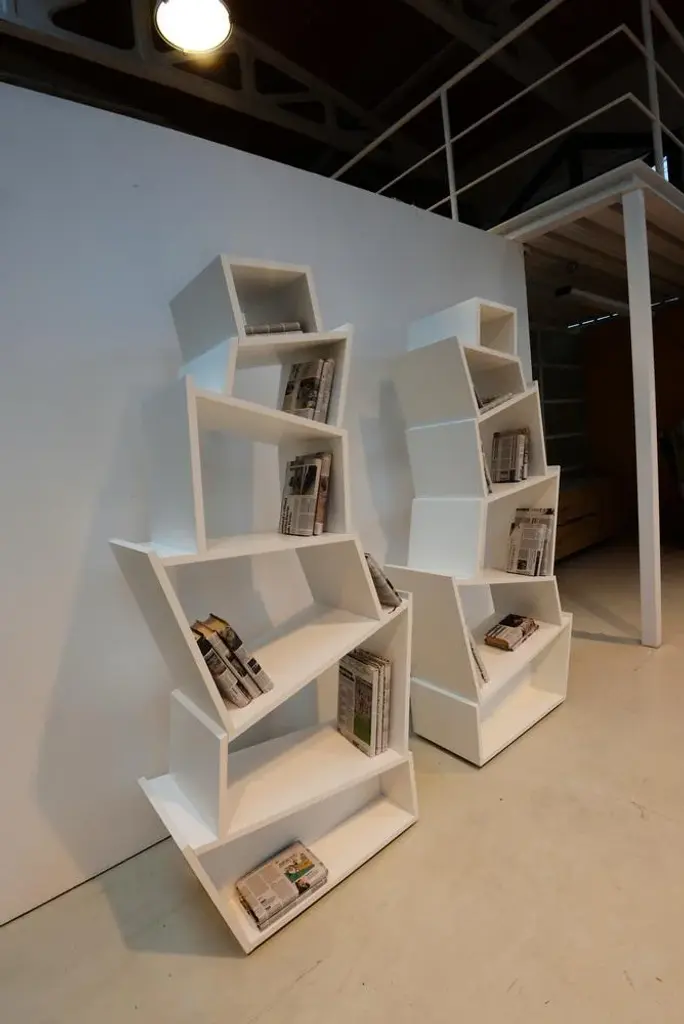 "Babylon is an expression of a balanced relationship of inclined planes that revolutionizes the traditional bookcase scheme and creates capacious and irregular storage spaces capable of accommodating books and objects of different sizes. It can be placed against the wall, or it can be used as a free-standing decorative element. The vertical bookcase is lacquered matte white." Signed by Maker