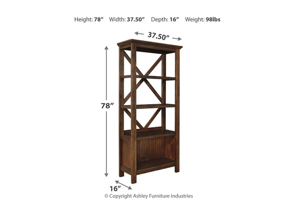 Leaning toward a casually cool look with a touch of rustic industrial flair? The Baldridge bookcase takes a fresh stance on style. Clean-lined profile with crossbuck back is complete with saw marks for distinctive character. Weight 98.000 lbs. (44.1kgs.)