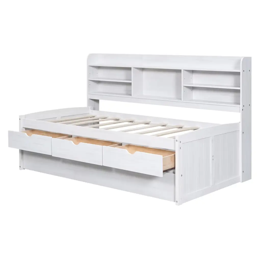 Bellemave Twin Captain Bed With Bookshelves, 3 Drawers & Trundle, Wooden Daybed Frame For Kids, Teens, Dorm, Guest Room, White