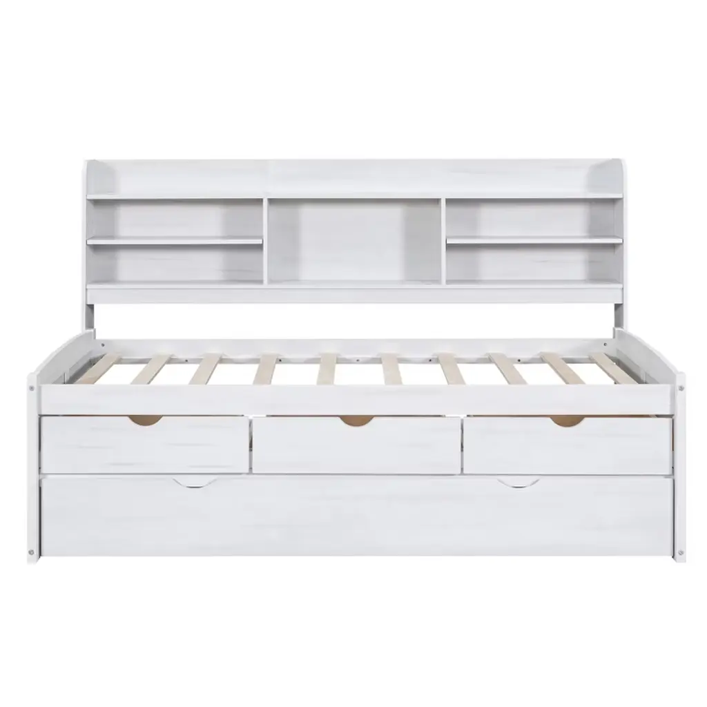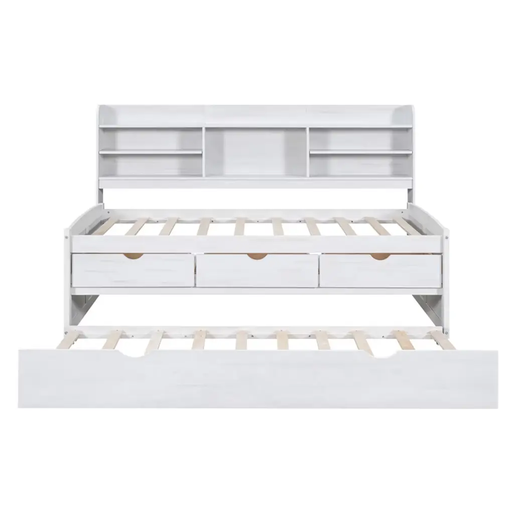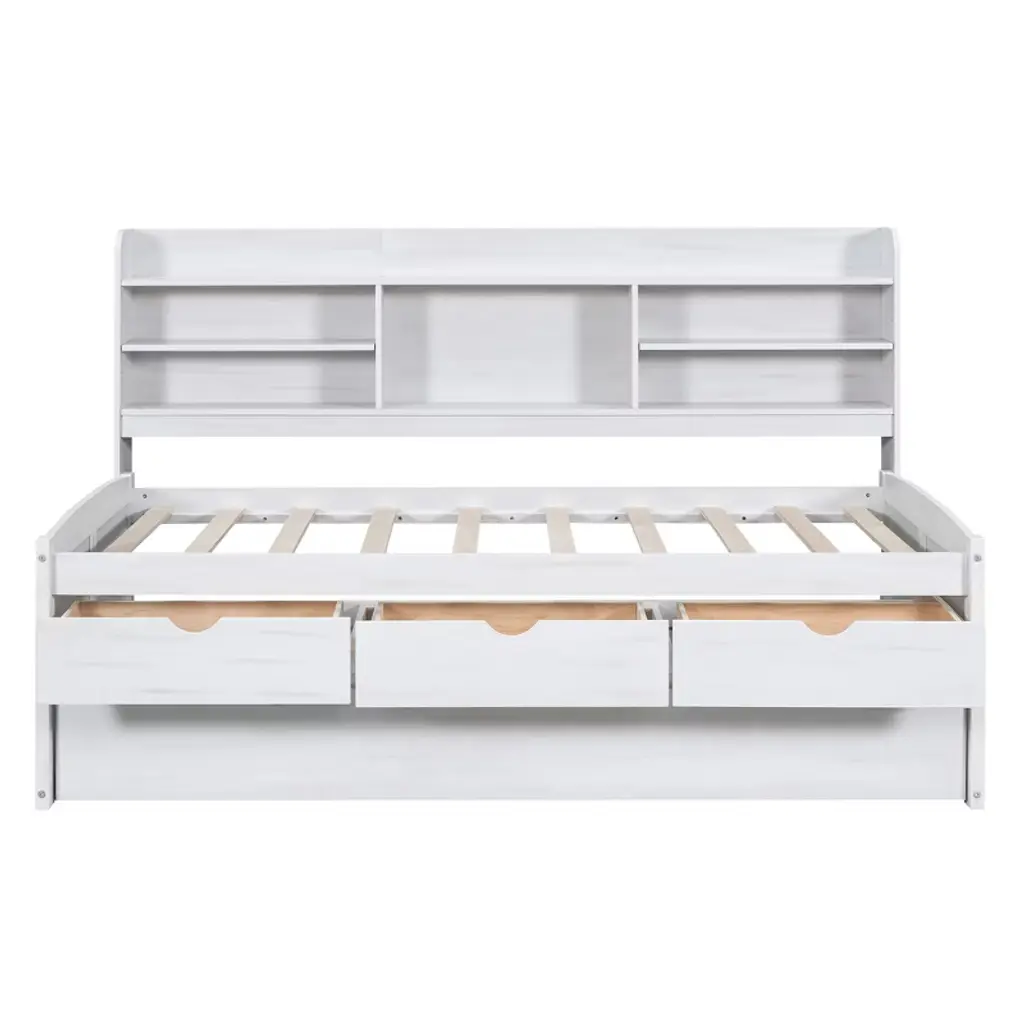 Crafted of solid pine wood and MDF in a smooth finish, this bed strikes a classic silhouette with a rectangular storage headboard. Functional and inviting, this bed with bookcase headboard and drawers has style and storage in spades. This wooden bed features three large storage drawers, a bookcase headboard, and a t-molding finish. And there is also a pull-out trundle for you to entertain overnight friends or guests.