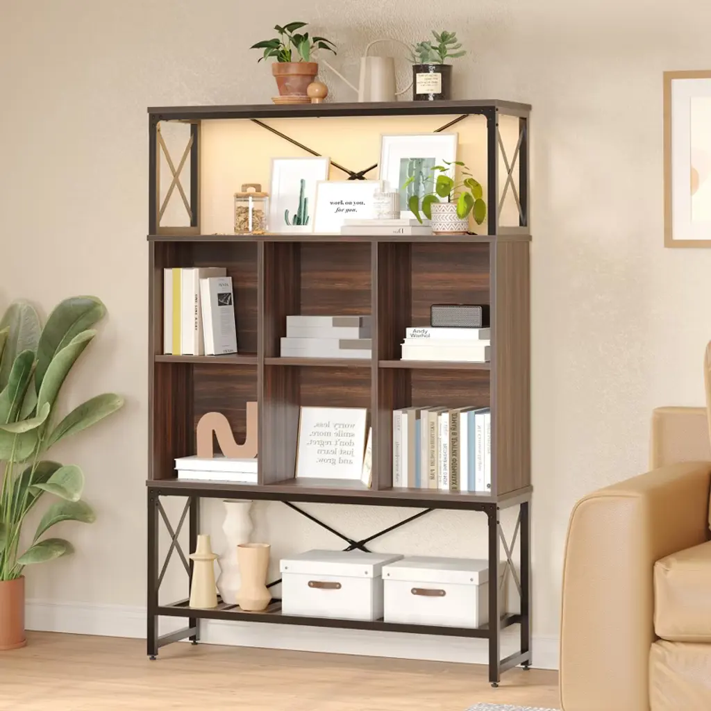 Bestier 43" W Bookshelf With Led Light, Industrial Bookcase With 6 Cubes And 3 Open Storage Shelves, Walnut