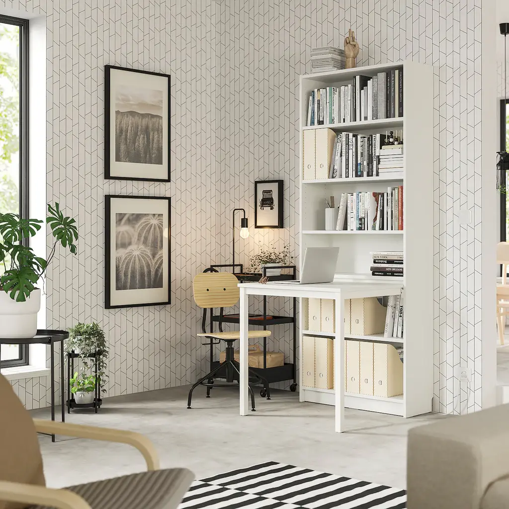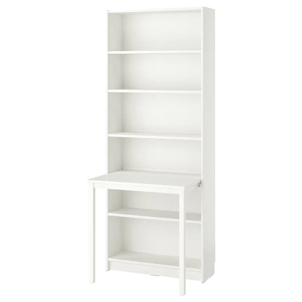 BILLY Bookcase with desk - white 31 1/2x79 1/2 ". Can be used with BILLY height extension unit in the same width for added storage vertically. May be used with doors; available in different colors and designs. May be completed with extra shelves to add storage space. Max load on table top: 55 lbs..