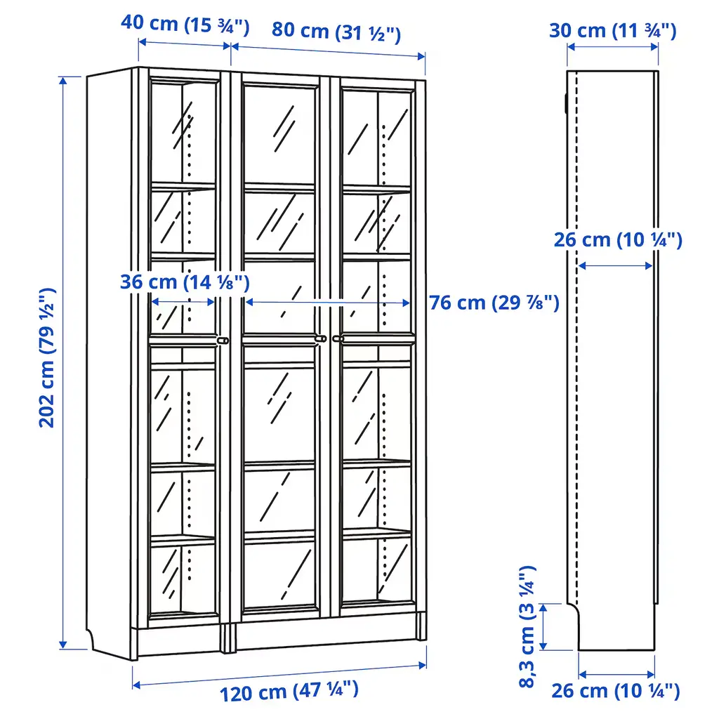 BILLY / OXBERG Bookcase comb w glass doors - dark brown oak effect/clear glass 47 1/4x11 3/4x79 1/2 ". Product is possible to recycle or use for energy recovery, if available in your community. Can be used with BILLY height extension unit in the same width for added storage vertically.