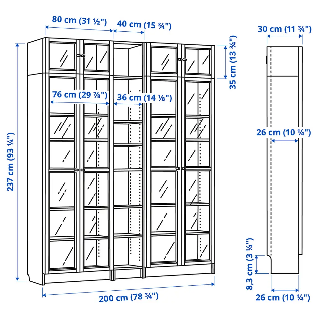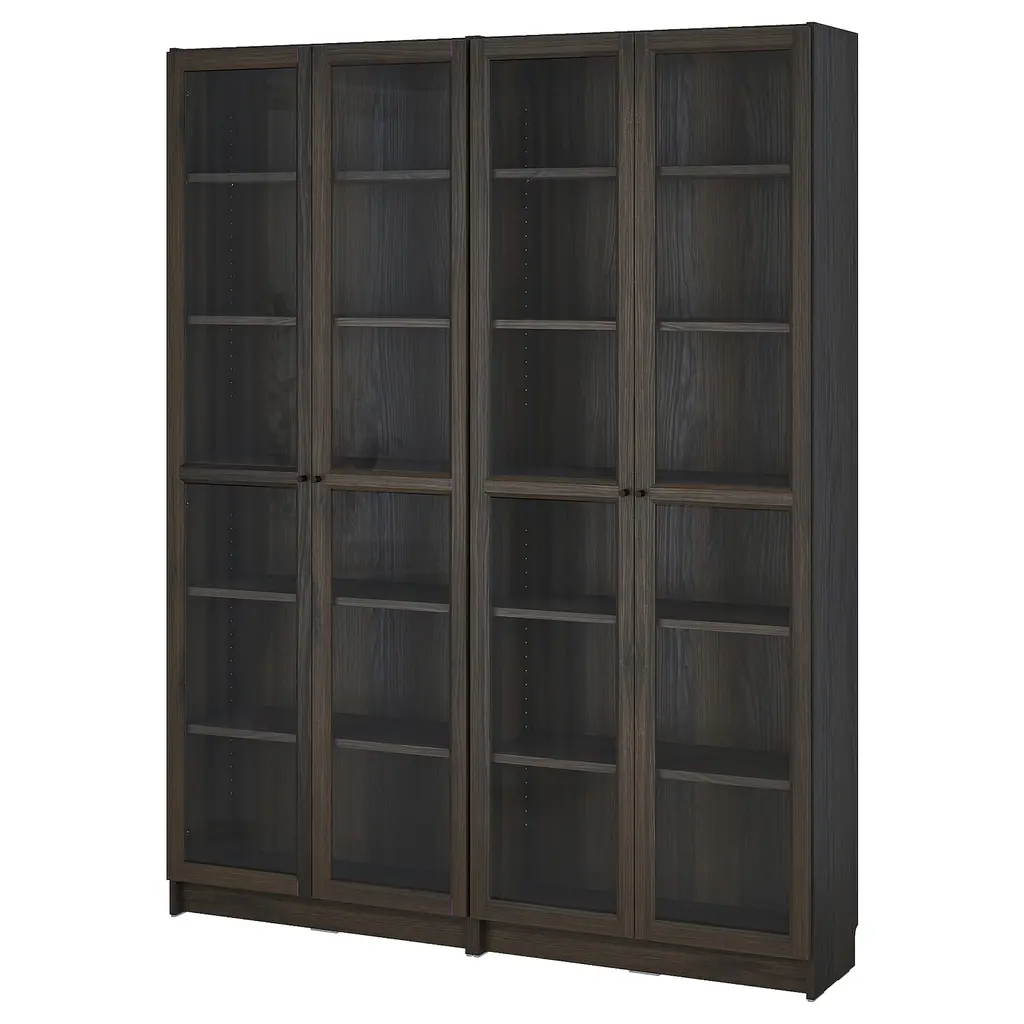 BILLY / OXBERG Bookcase w glass doors/ext unit - dark brown oak effect 78 3/4x11 3/4x93 1/4 ". Product is possible to recycle or use for energy recovery, if available in your community. Can be used with BILLY height extension unit in the same width for added storage vertically.