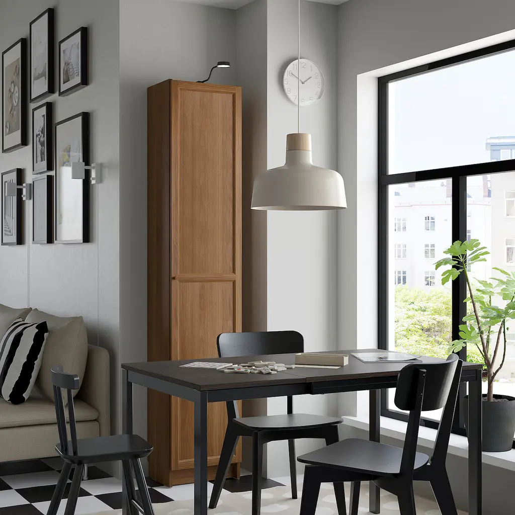 BILLY / OXBERG Bookcase with doors - brown walnut effect 15 3/4x11 3/4x79 1/2 ". A panel door hides your belongings and protects them from dust. Adjustable shelves can be arranged according to your needs. This furniture must be secured to the wall with the enclosed wall anchoring device.