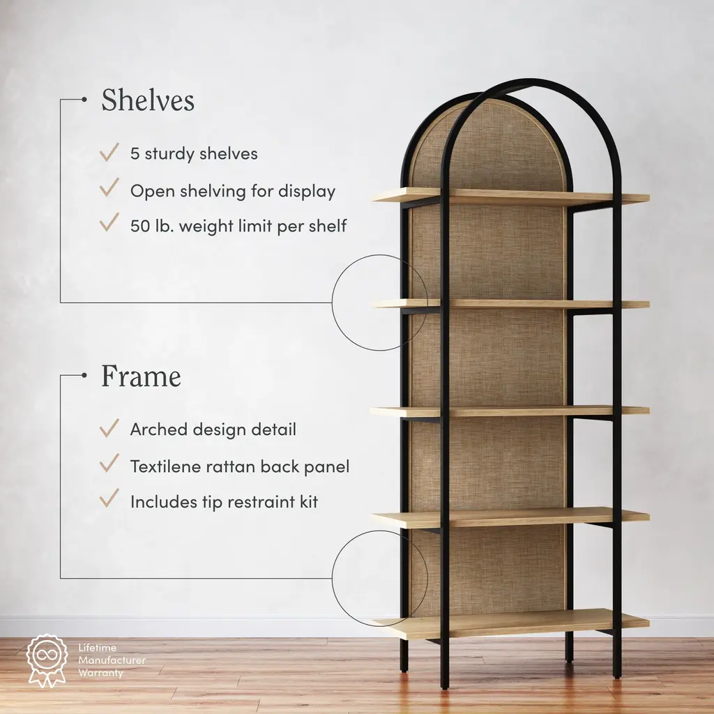 Get ready to fall head over heels for the Amara Bookshelf—the epitome of boho elegance! Constructed with love, this bookshelf features a sleek metal frame with an eye-catching geometric arch design in a trendy black finish. Its five thick shelves are perfect for showcasing your cherished books and adding a personal touch to your space. The back panel is crafted with on-trend durable textilene rattan, infusing your room with that irresistible boho vibe. Safety is a priority too, as we include a tip restraint kit to keep your bookshelf securely anchored to the wall. Let our Amara Bookshelf be the answer to your home's storage and style needs!