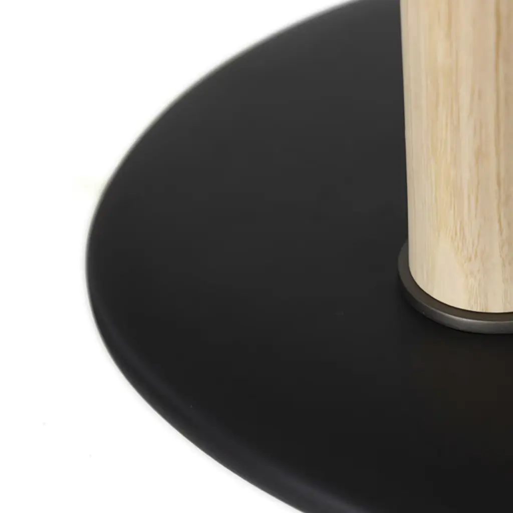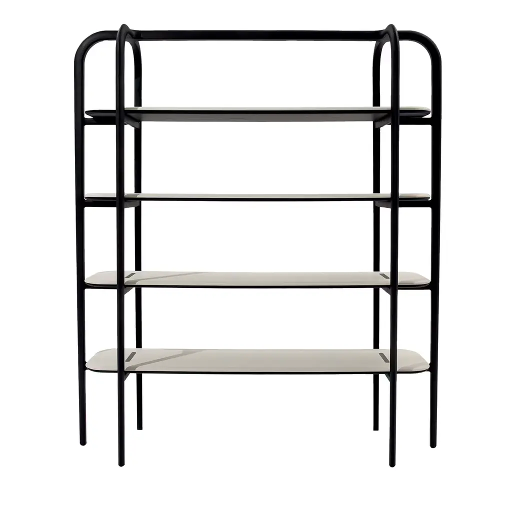 Discover this Konus bookshelf, a sculptural piece of furniture with shelves without a single straight line held together by conical pillars arranged in a triangle with natural wood pillars and lacquered shelves.