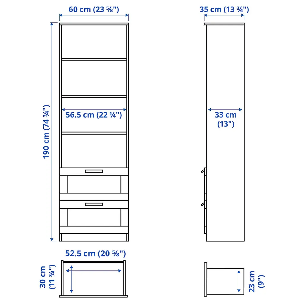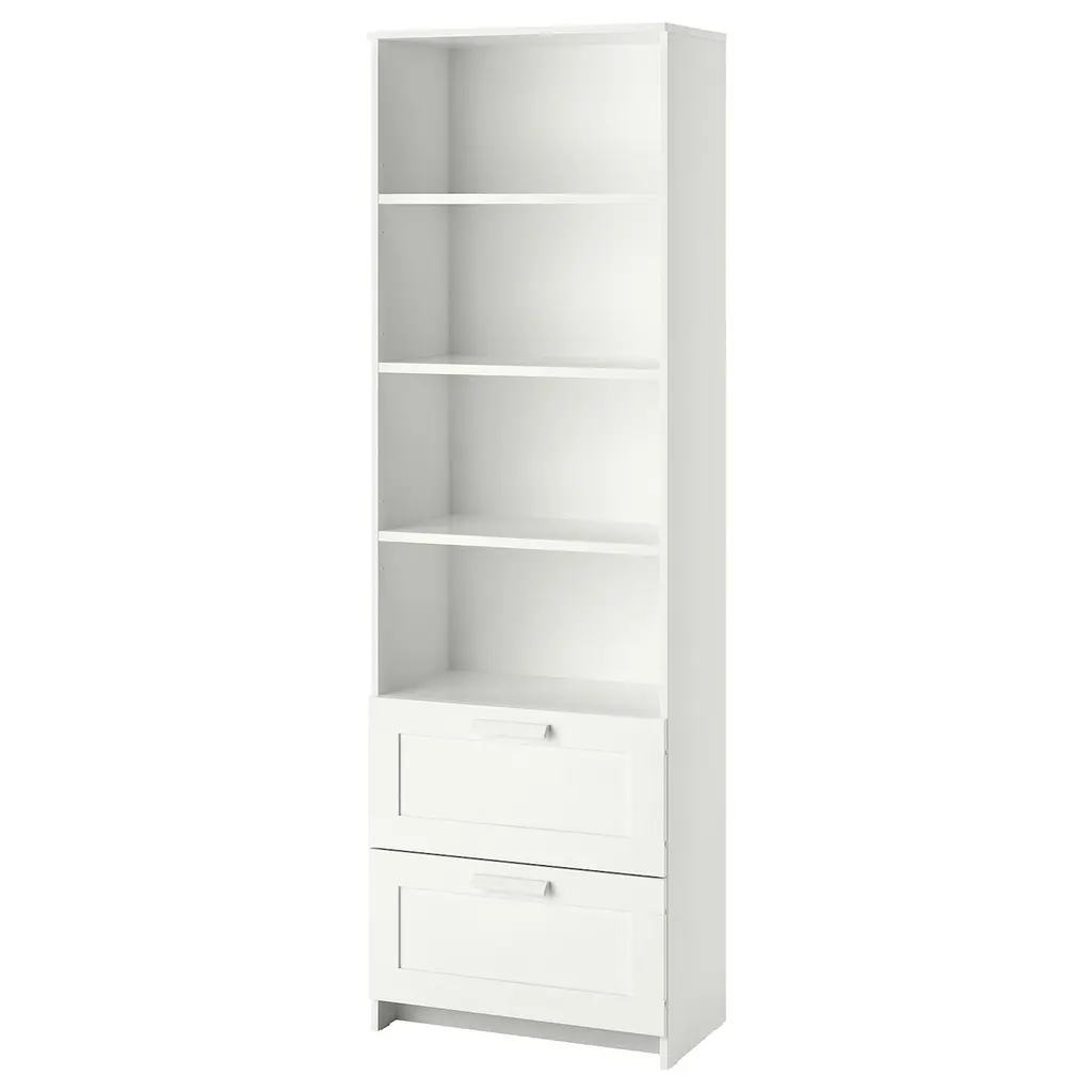 BRIMNES Bookcase - white 23 5/8x74 3/4 ". Adjustable shelves, so you can customize your storage as needed. Smooth-running drawers with drawer stops to keep them in place.