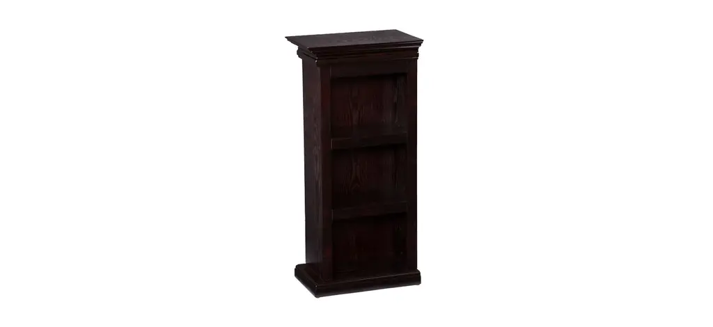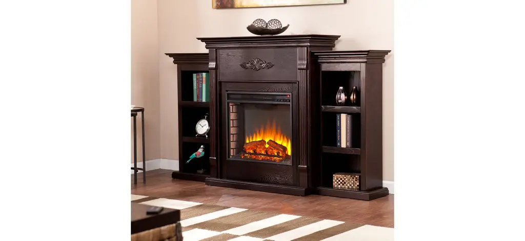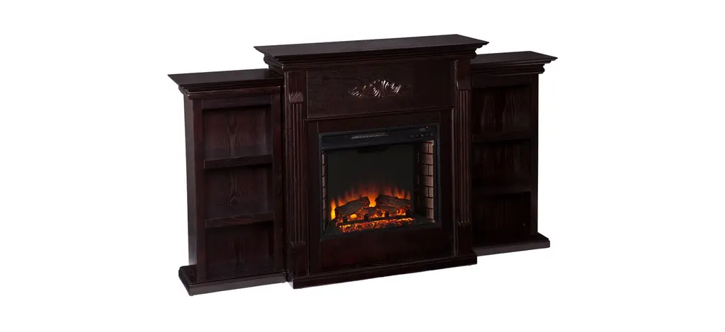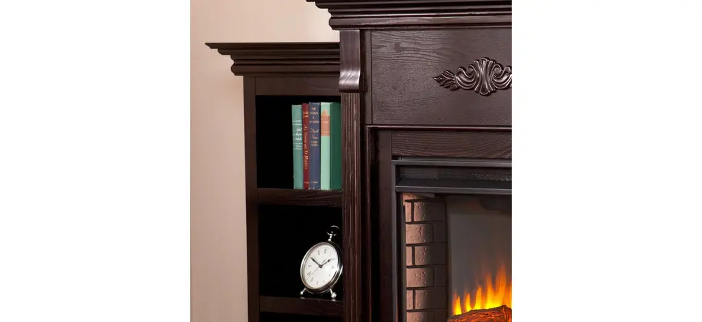 The Bruton is a beautiful and functional electric fireplace features a glazed pine finish that looks great in any room. A classic floral design is carved across the top of this fireplace. Three bookcase shelves on either side of the firebox provide space and storage for all of your favorite readings, media, and home décor accessories.