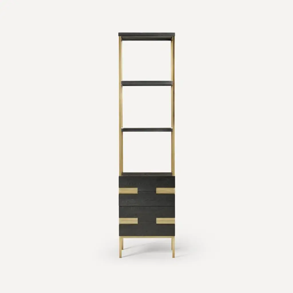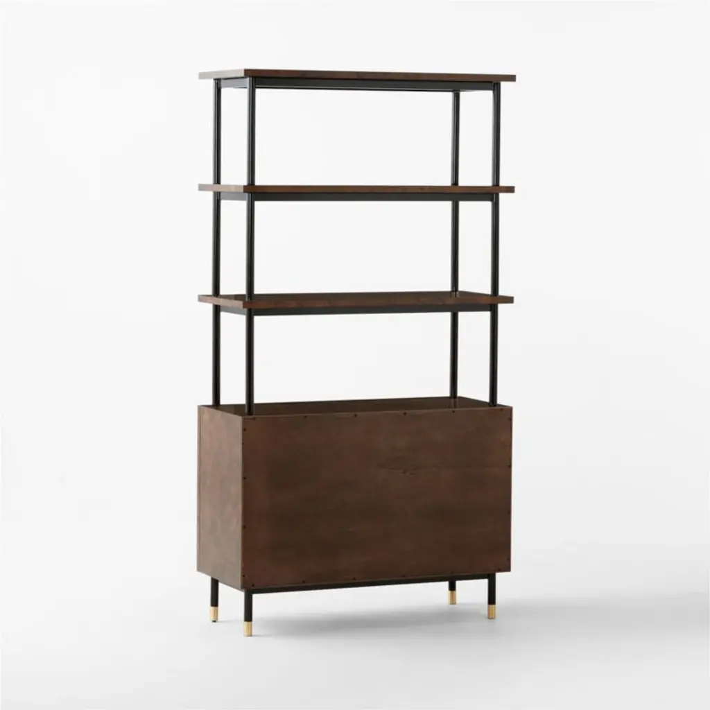 Modern bookshelf by Barcelona-based Mermelada Estudio is informed by classic art deco design with its rich burl wood veneer, precisely diamond-matched for symmetry and a pleasing aesthetic. Slim satin black uprights frame three shelves and a cabinet below. Legs are capped with brass to match the circular brass pulls. Brass is unlacquered, offering a living finish with the patina of a vintage find. CB2 exclusive.Due to the nature of the material, brass patina will vary in color and darken over time.