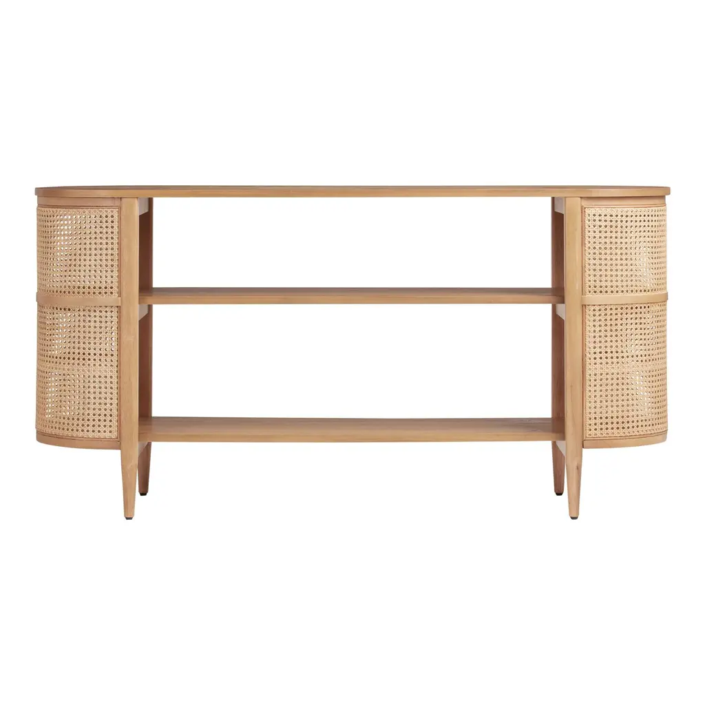 Durably crafted of solid wood with tapered legs, our wide, low-slung Cecile bookshelf features curved ends adorned with textural open-weave rattan cane. An on-trend blend of wood and natural fiber, the Cecile is versatile storage furniture with a broad surface, open shelves and a low profile. Its upscale bohemian beauty adds an organic element to the office as a bookcase, the living room as a console table and the dining room as a bar or buffet.