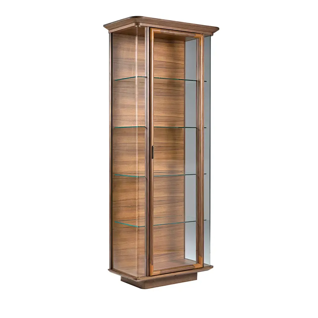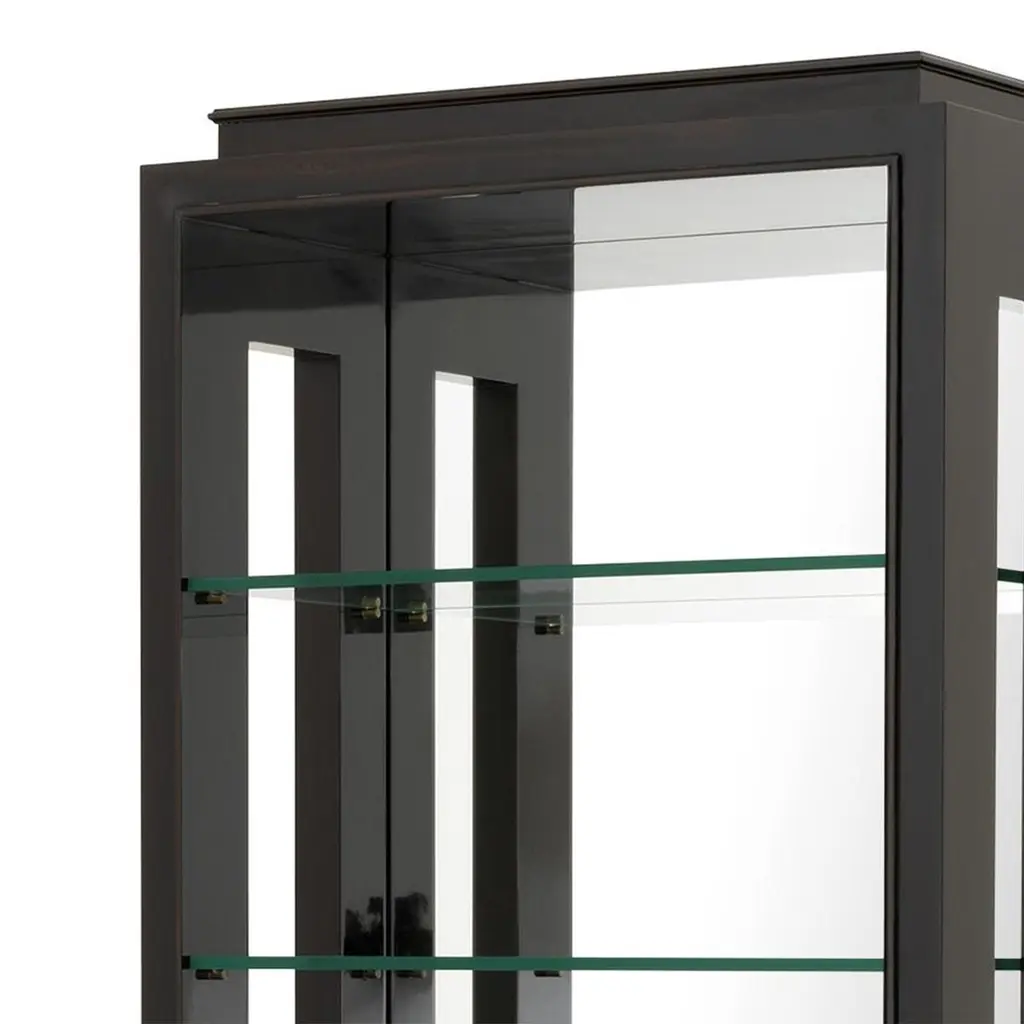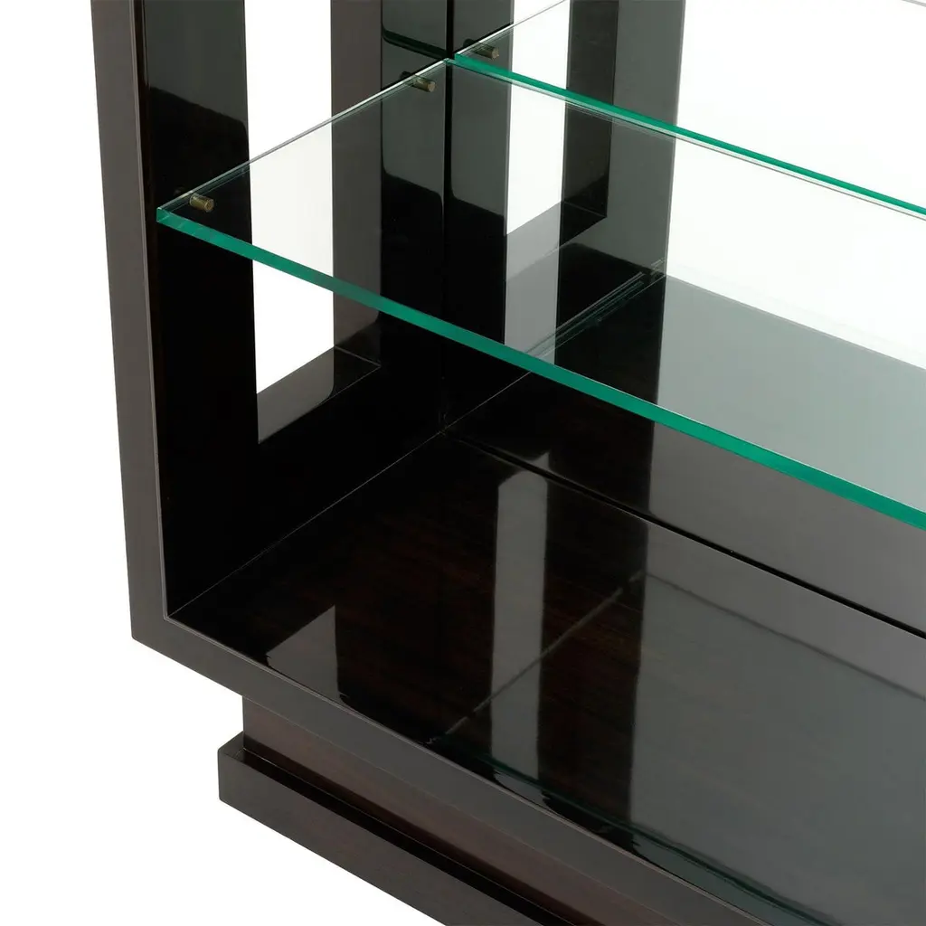 Bookshelf Colonial with solid wood structure withsmoke eucalyptus veneer in gloss finish, with glass shelves and with mirrored back in side the bookshelf.