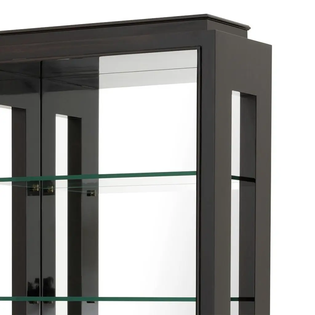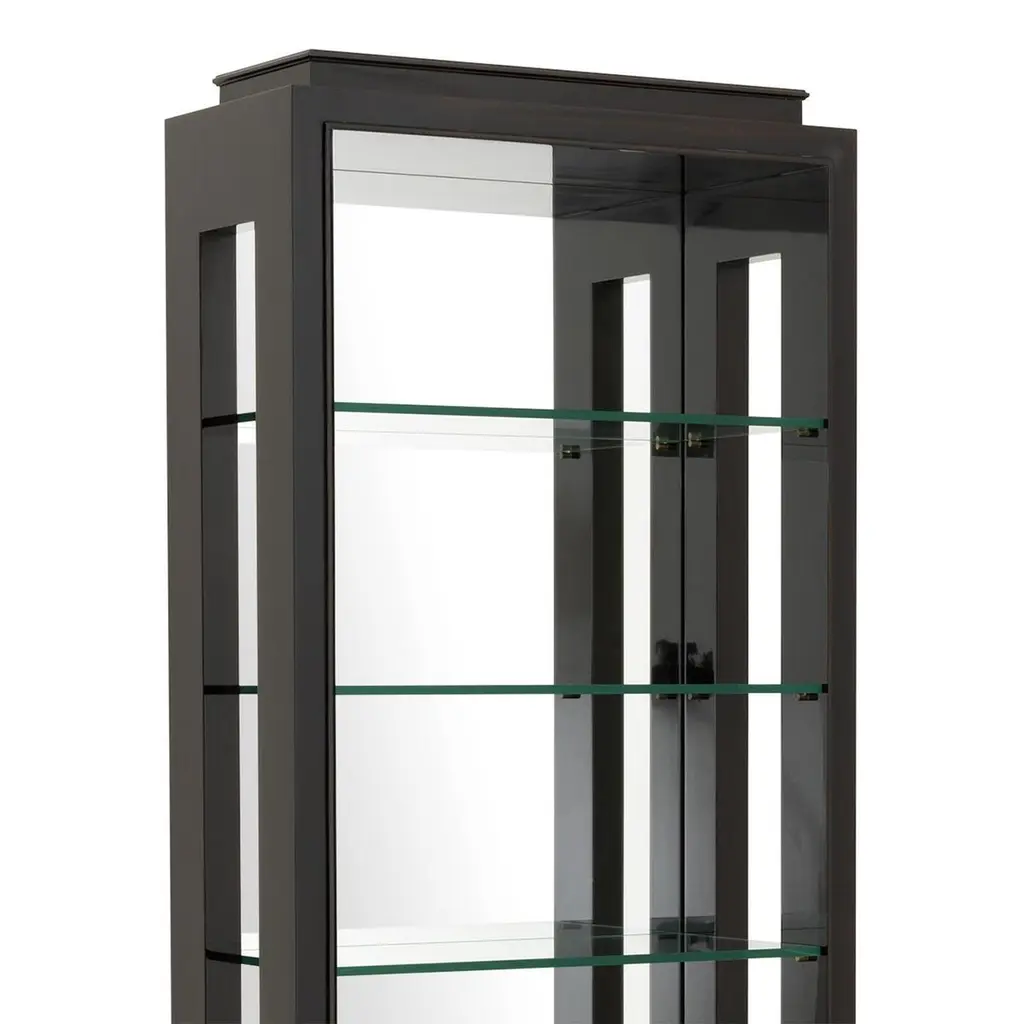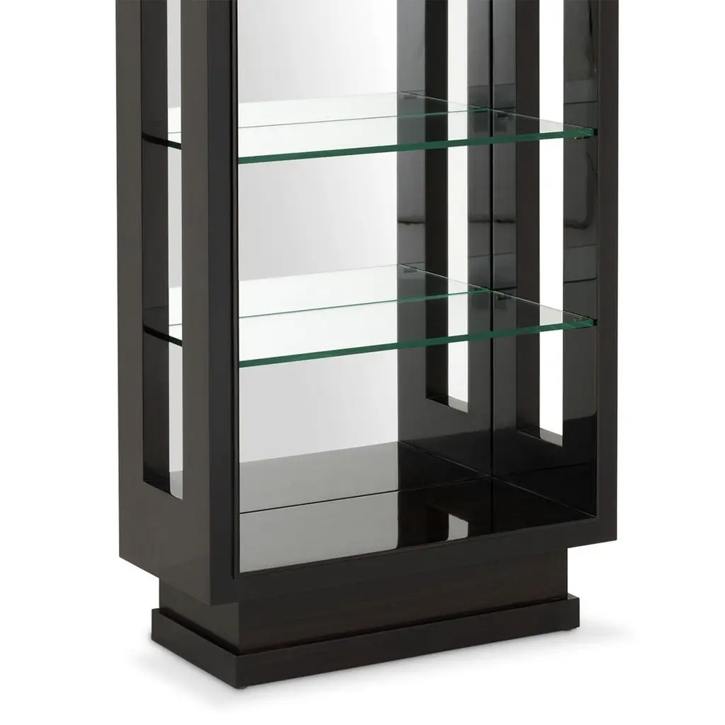 Bookshelf Colonial with solid wood structure withsmoke eucalyptus veneer in gloss finish, with glass shelves and with mirrored back in side the bookshelf.