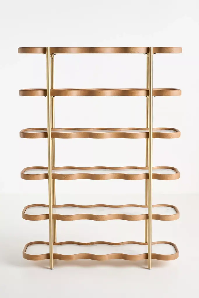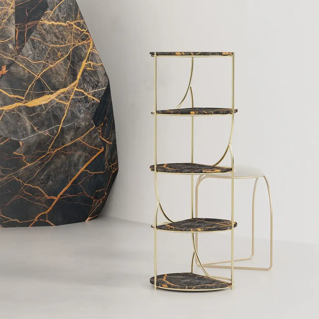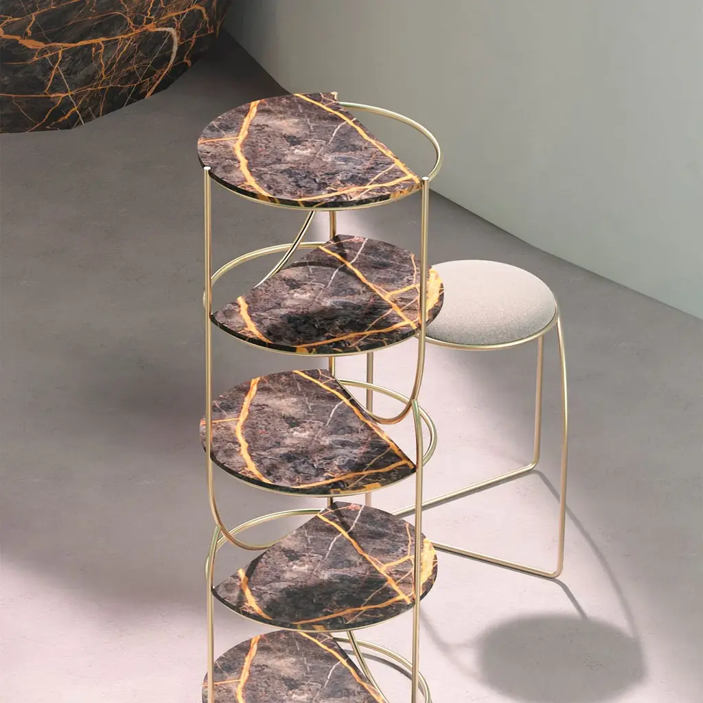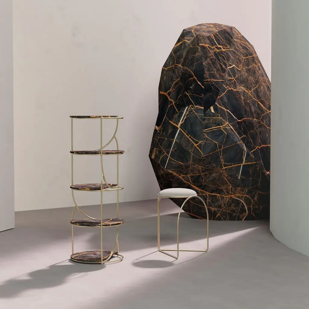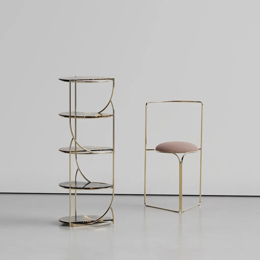 The geometric pattern takes shape in the space through the use of metal wire. A large-scale composition that reveals itself to the observer based on their point of view. Cosette 110 is a bookshelf designed by Enrico Girotti, made of gold and chrome galvanized steel with repositionable shelves in marble. Each piece of furniture is individually and comes with a signed Certificate of authenticity. Also available in other finishes and measures, please contact the concierge.