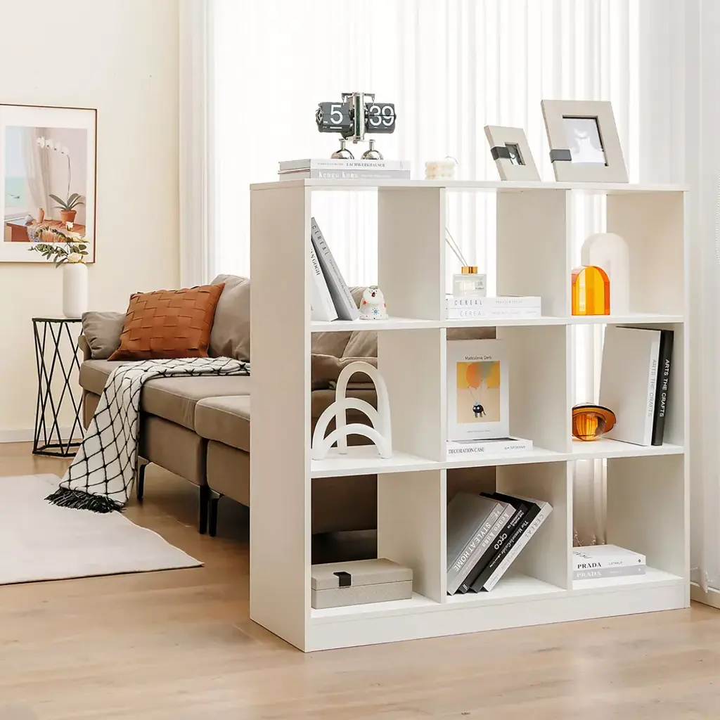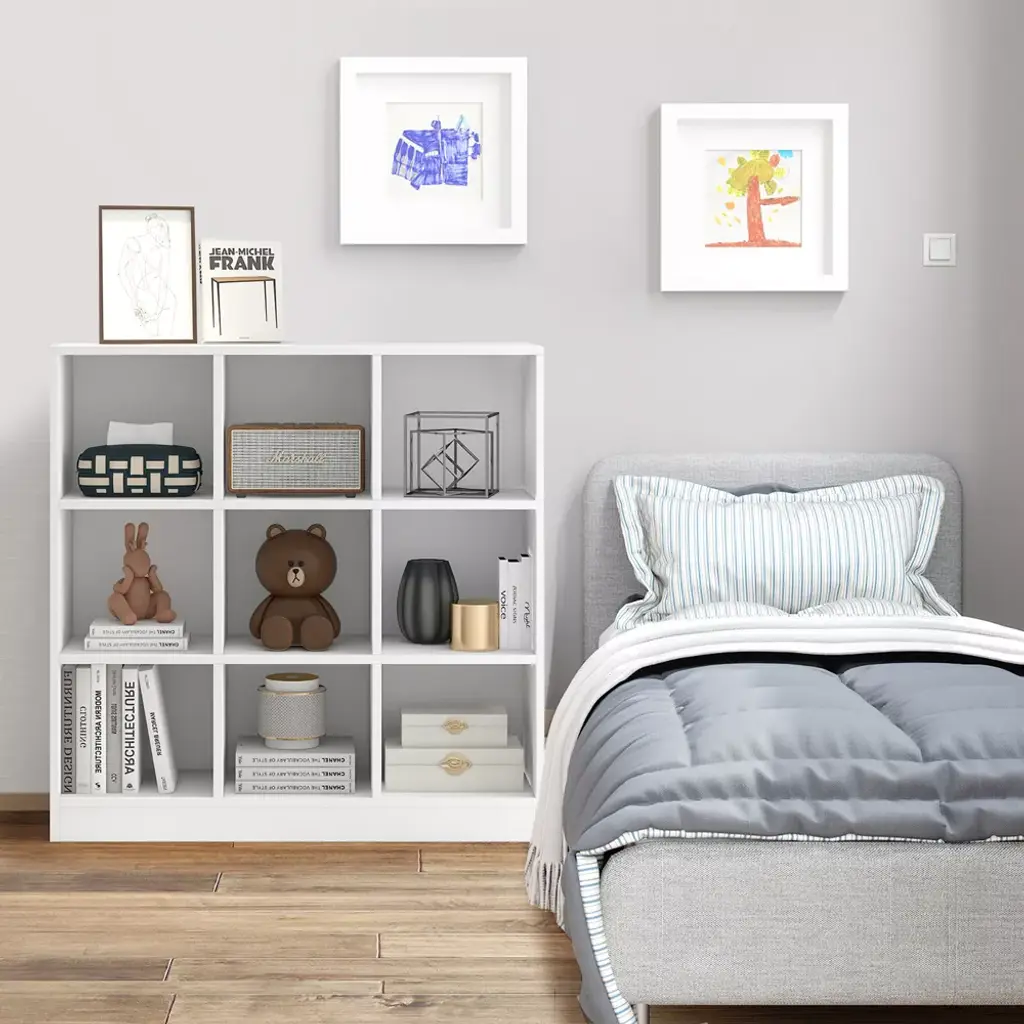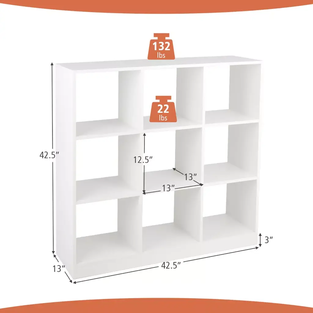 Do you hate to see kids toys scattered here and there? Come and get this 9-cubby toy cabinet for help! The toy organizer consists of 4 tiers of shelves and 9 open compartments, which are all of the appropriate height for kids to reach. In addition to making your room tidy, the kids bookshelf will also boost your little one's interest in reading and let them develop good habit of storage. Moreover, with smooth surface and covered screw holes, you can let them touch the unit and do the organizing with confidence. Moreover, the 4-tier bookcase with wide base will never wobble or tip over. It is equipped with anti-toppling device, which can help secure the cabinet in against of falling accidents.FeaturesIntegrates 4 tiers of storage shelves and 9 cubes for toys and books Let kids learn to organize and classify their stuff and keep them in order Equipped with anti-toppling device to increase the overall stability Comes with round white stickers to cover up screw holes Cabinet equipped with baseboard to keep away from dirty floors Smooth surface is waterproof for easy cleaning & maintenance Works well in kids' room, living room, study and entrywayColor: White Material: Engineered Wood Overall Dimensions: 43.5'' x 13'' x 43.5'' (L x W x H) Dimensions of Each Cube: 13'' x 13'' x 12.5'' (L x W x H) Baseboard Height: 3'' Maximum Weight Capacity: 330 lbs Net Weight: 63.5 lbs Package Includes: 1 x 9-Cubby Kids Bookcase 1 x Instruction