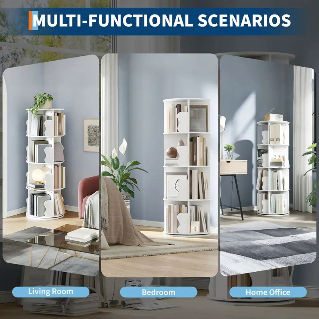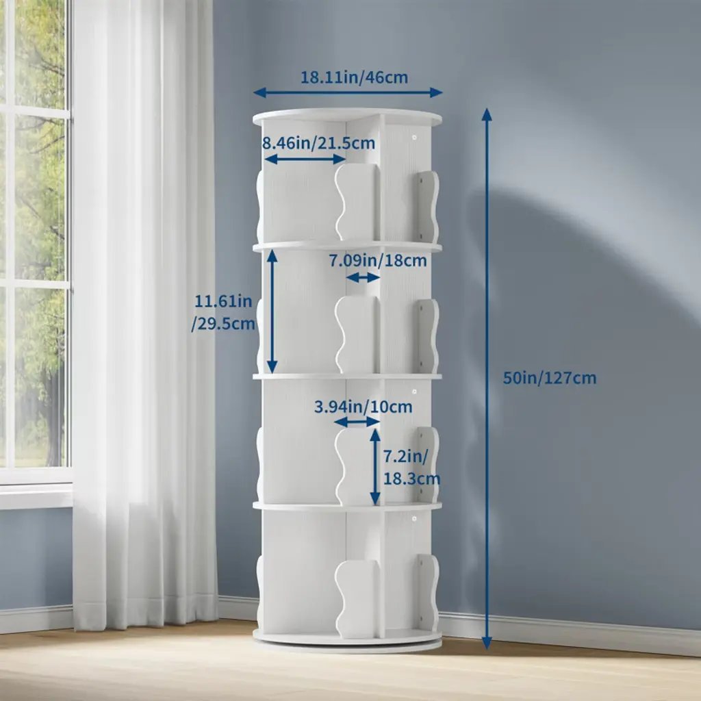 Introducing the 4 Tier Spinning Bookshelf Tower, a unique and functional addition to any home or office space. This 360 bookshelf rotating is designed to bring both style and convenience to your room, making it an ideal choice for kids' rooms, living rooms, bedrooms, studies, or home offices. Its rotating feature allows easy access to your books and items from all angles, enhancing your room's decor while keeping your collection organized.Features and Benefits:- This bookshelf features a 360-degree rotating design, allowing you to spin the shelves effortlessly to find your favorite book or display item. - The 4-tier structure offers ample storage space for books, toys, decor, and more, making it perfect for kids' rooms or any area where organization is key. - Its sturdy wood construction ensures long-lasting use, while the revolving mechanism adds a playful and practical element to your storage solutions.Versatility and Aesthetics:The spinning bookshelf seamlessly fits into various room styles, from modern to traditional. Its sleek, wooden finish adds warmth and charm to any space, enhancing the overall aesthetic. Whether placed in a child's bedroom, a home office, or a living room, this rotating bookcase serves as both a functional organizer and a stylish display piece.Assembly and Maintenance:Assembly is straightforward and user-friendly, with all necessary tools and instructions included. The rotating mechanism is smooth and requires minimal maintenance. To keep the bookshelf looking its best, simply wipe it down with a soft, dry cloth to remove dust and maintain its natural wood finish.The 4 Tier Spinning Bookshelf Tower is a versatile, stylish, and practical storage solution that elevates your home decor while keeping your books and items neatly organized. Its unique rotating design makes it a standout piece that is both fun and functional, perfect for any room in your home.