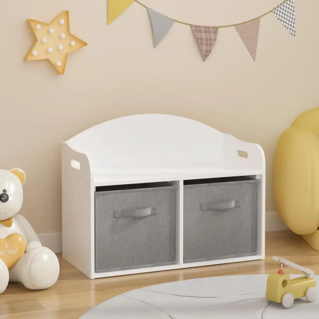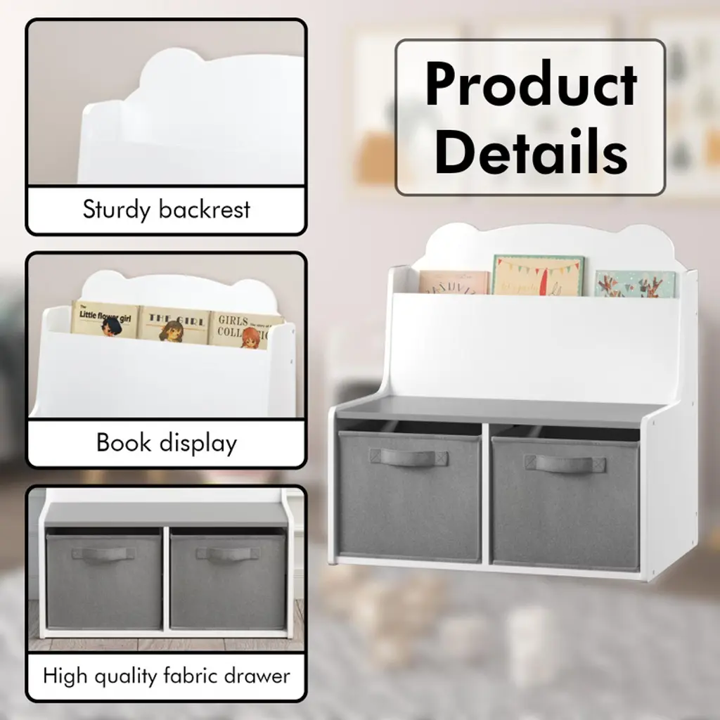 This kids bookshelf features a top book display shelf and two spacious fabric bins, helping children easily organize their favorite books, toys, and games—all in one compact space.
