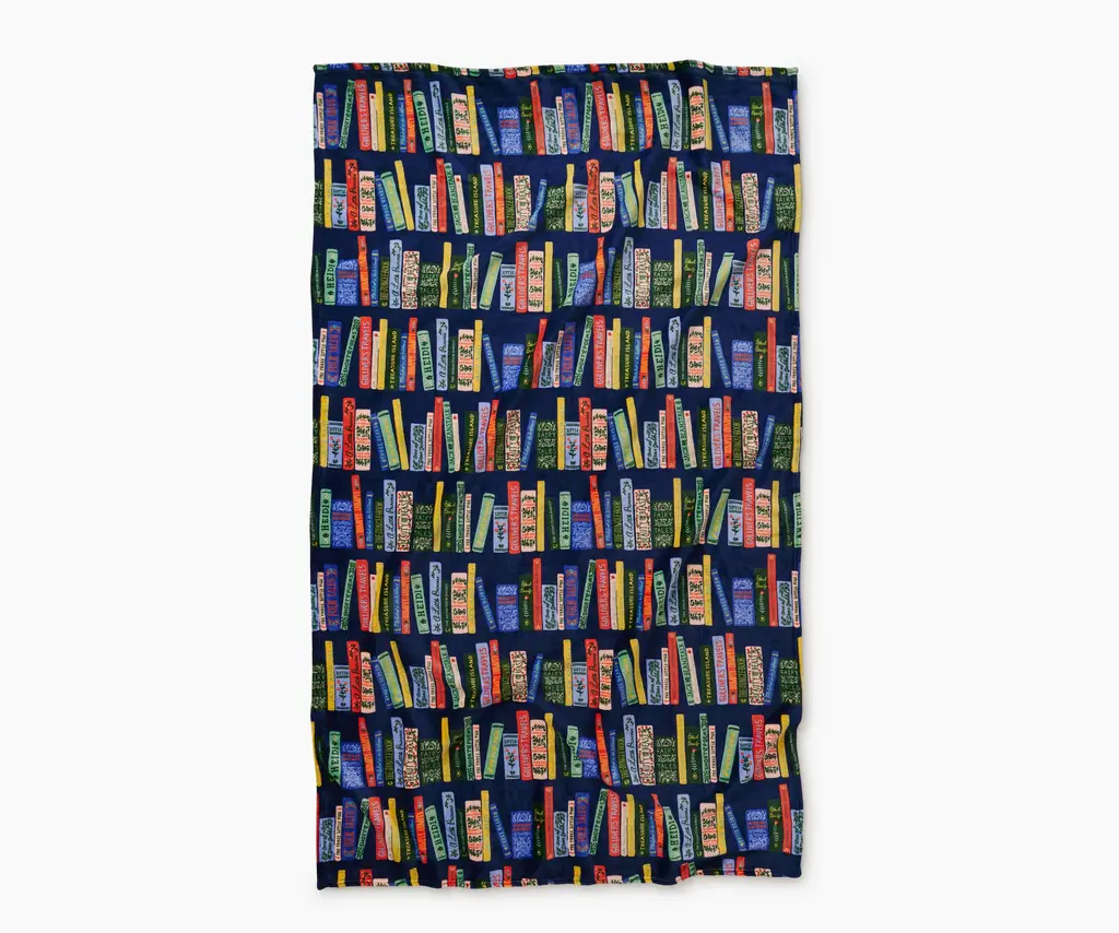 Curl up with a good book and our bookshelf fleece blanket, featuring a line up of our favorite classic titles. Made of plush fleece, the blanket comes packaged with a ribbon so it's ready to gift.