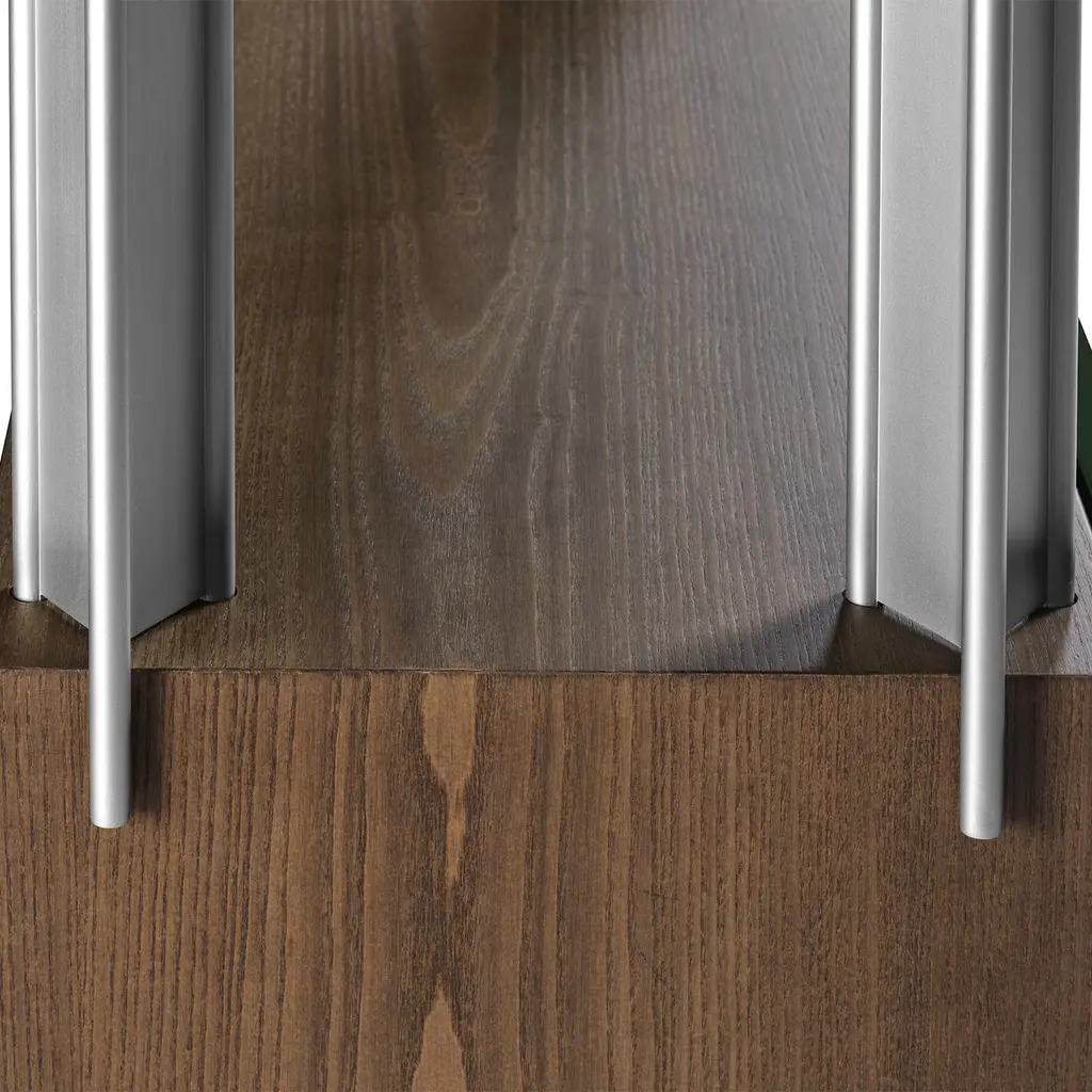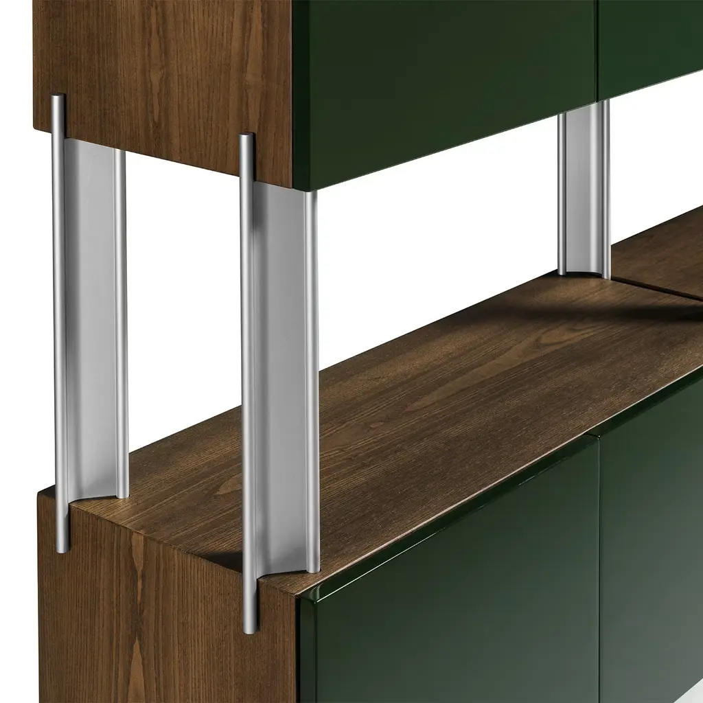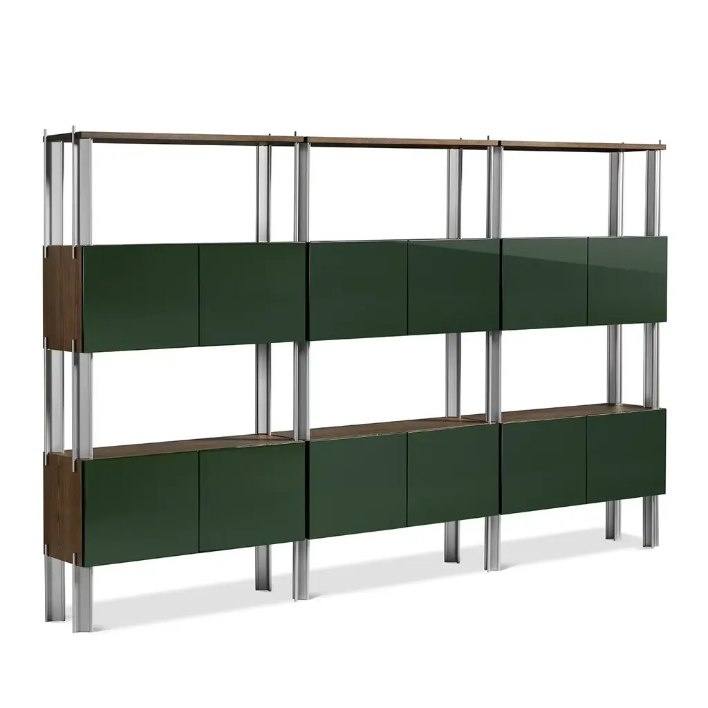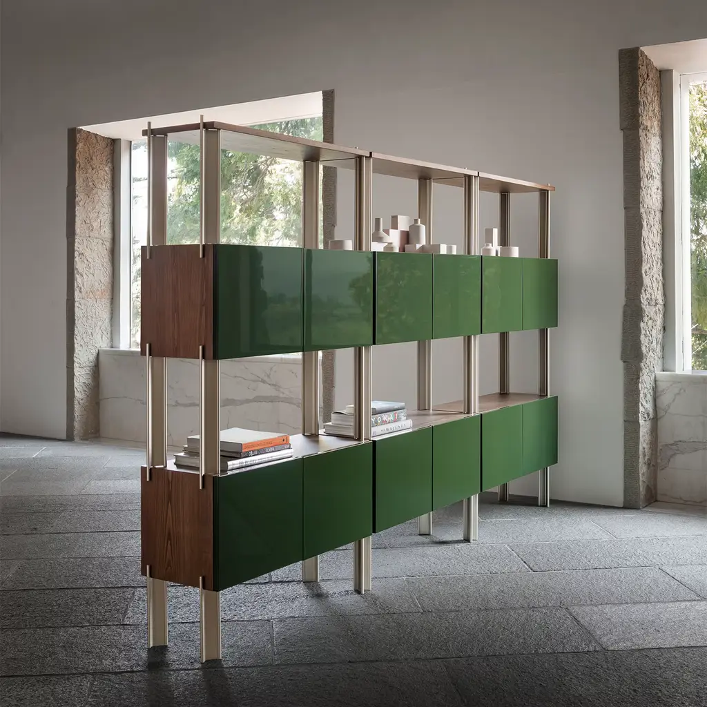 The Flexor bookshelf features a modular design with an aluminum extrusion structure that offers endless configuration possibilities. Robust metal elements securely connect and support multiple wood containers, creating a versatile and sturdy storage solution. Its sleek lines and bold green finish combine modern functionality with distinctive style suitable for contemporary interiors.