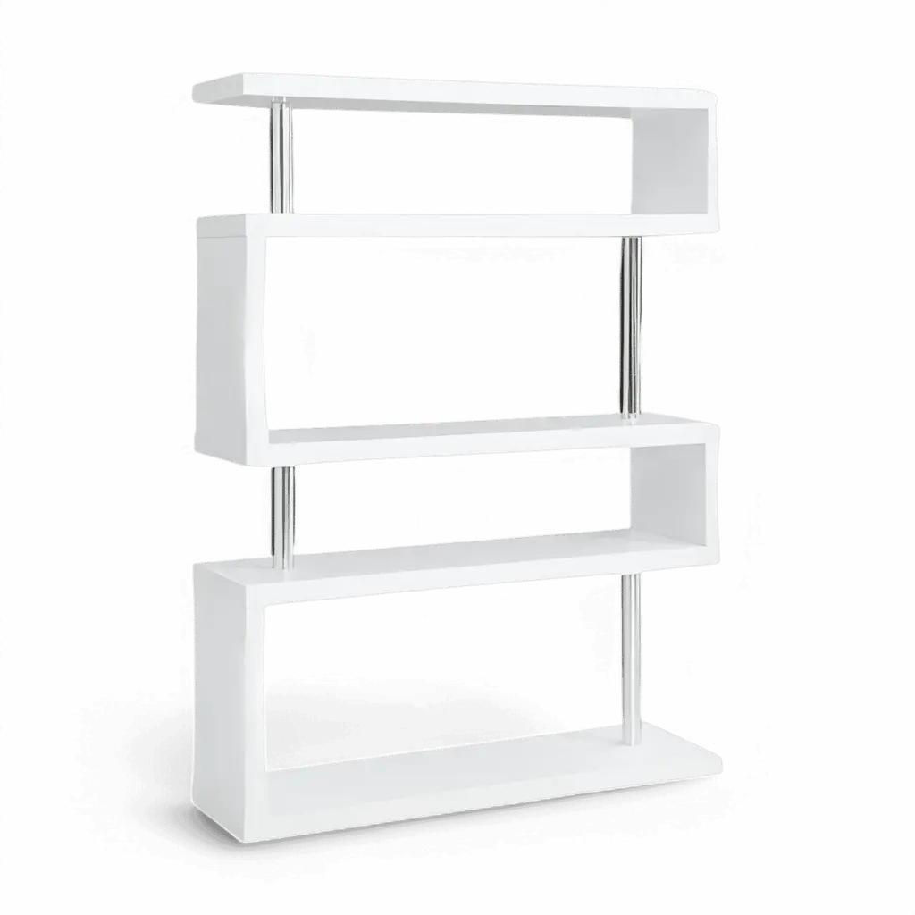 The modern and minimalistic Floyd Bookshelf in White displays items in an organized and decorated fashion for efficient space utilization. Versatile and unique, the zig-zag construction highlights modern influence while providing ample storage for treasures. The high gloss, stark white, wood finish sparkles against any color, creating the ideal focal point.White High-Gloss Lacquered Engineered Wood & Stainless Steel