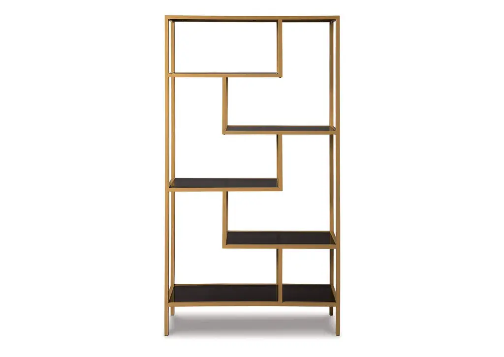 Simple structures make for the coolest designs. The Frankwell bookcase builds on its architectural bias with offset shelves to create a dynamic display in your space. With goldtone finished metal and gray tinted glass, this piece creates a sophisticated and modern silhouette to elevate any urban-inspired space. Weight 68.000 lbs. (30.6kgs.)