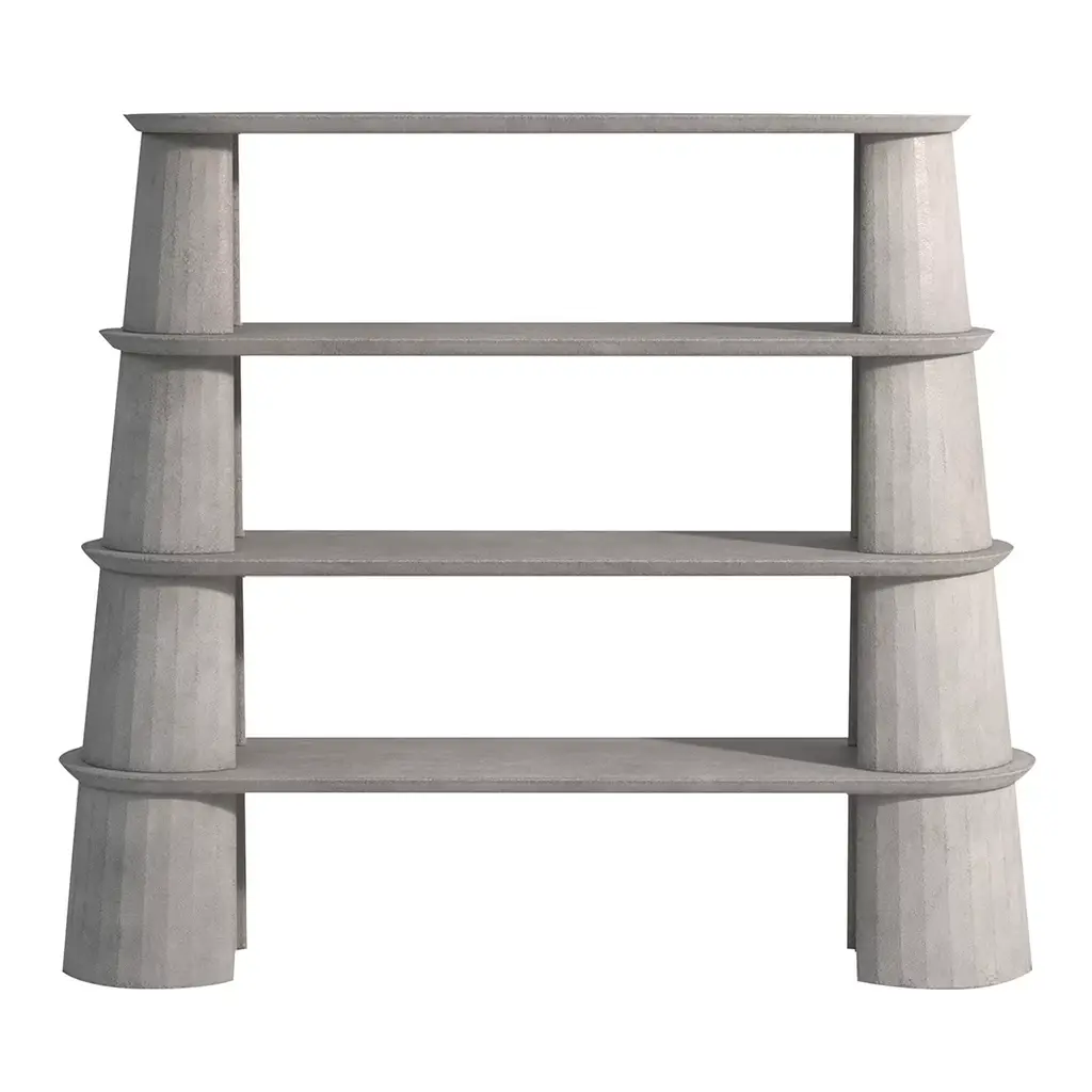 This exquisite bookshelf is part of a singular series of modular pieces, entirely crafted of ultra-high-performance sandblasted concrete, hand-treated with water repellent products. Marked by clean and essential lines that lend a lighter quality to this hard-edge material, it features two tall side-columns supporting four shelves. Boasting a fir green color, it is available in eight other hues upon request.