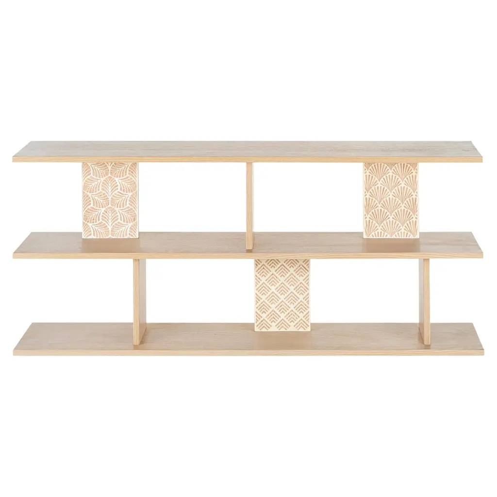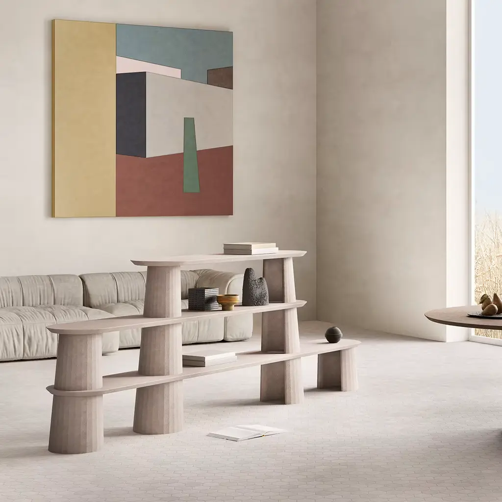 A stunning modular design, this sophisticated bookshelf is entirely crafted of ultra-high-performance concrete, rendered softer and lighter by the clean and essential design of strong geometric influence. Marked by a delicate powder beige color, this composition of four different-sized legs and three shelves is enhanced with a natural interplay of lights and shadows of captivating allure. This piece is hand-treated with water repellent products, and is available in eight different hues.