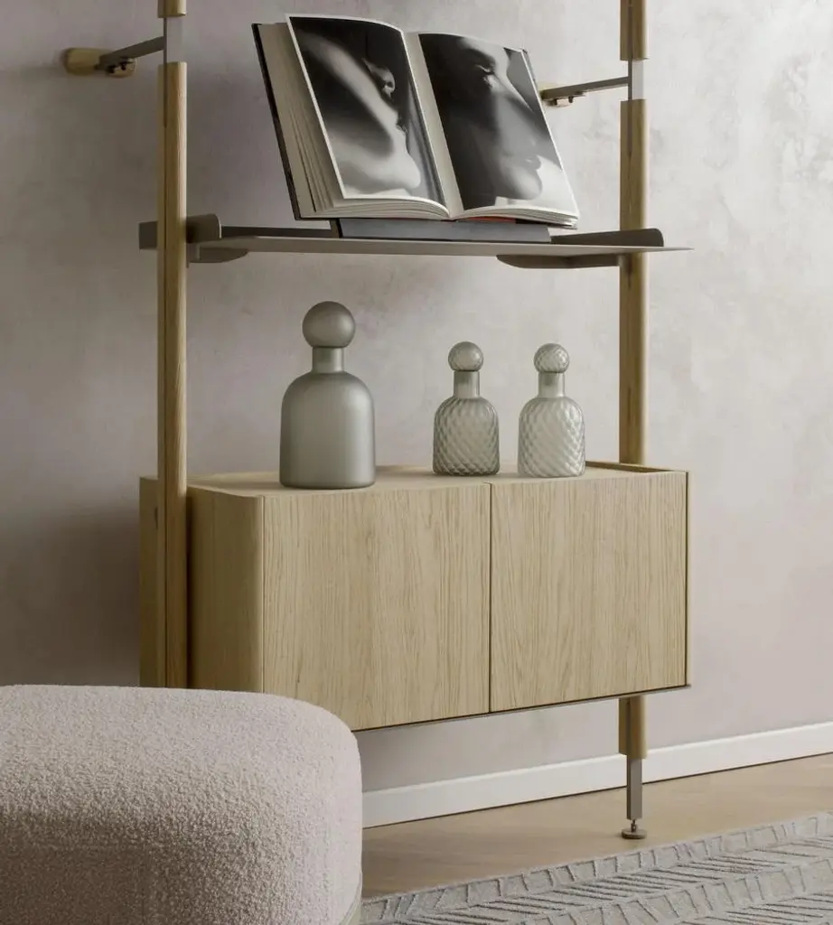 Galaxy oak wood bookshelf by morica design dimensions: d 46 x w 200 x h 253 cm. Materials: oak wood, champagne metal. 2 x m2 modules