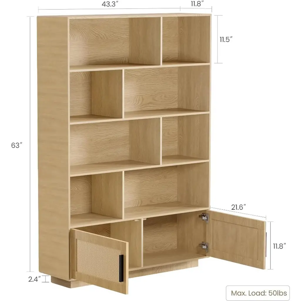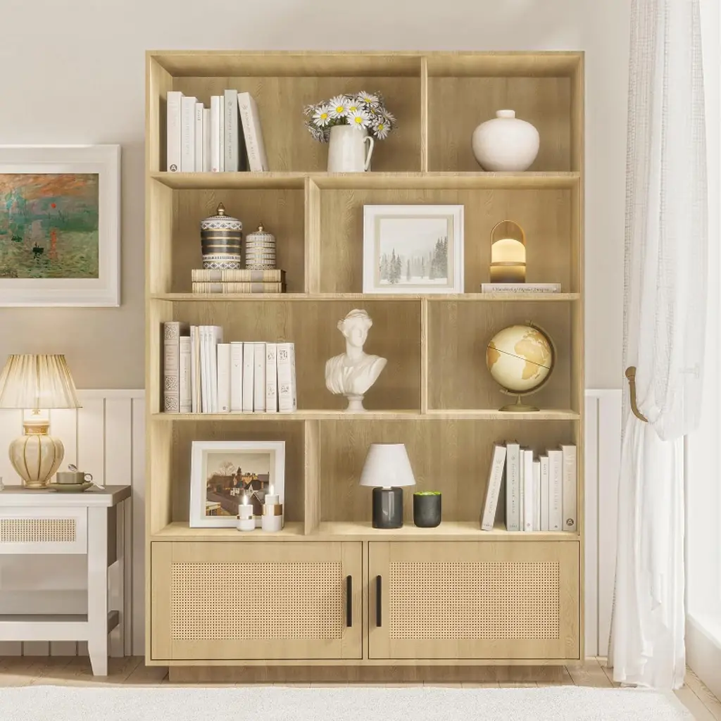 Gustowave 5 Tier Bookshelf With Rattan Doors, Wooden Bookcase And Bookshelf With Storage, 63in Tall Book Stand,wood