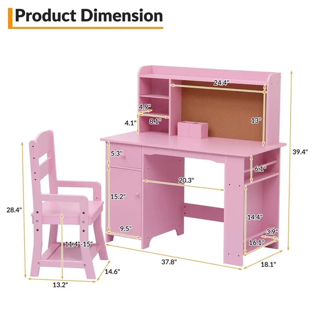 This kids’ study desk and chair set is designed for children aged 3-8, offering a comfortable and safe learning space with dimensions perfectly suited for young learners. The set includes ample storage options such as open shelves, a bookshelf, a cabinet, a drawer, and a cork board to help keep belongings organized. Made from durable MDF wood with non-toxic paint and rounded edges, it meets rigorous safety standards. Ideal as a birthday or educational gift, the set promotes organization and a positive learning environment. Easy-to-follow assembly instructions and responsive customer support ensure a smooth experience.