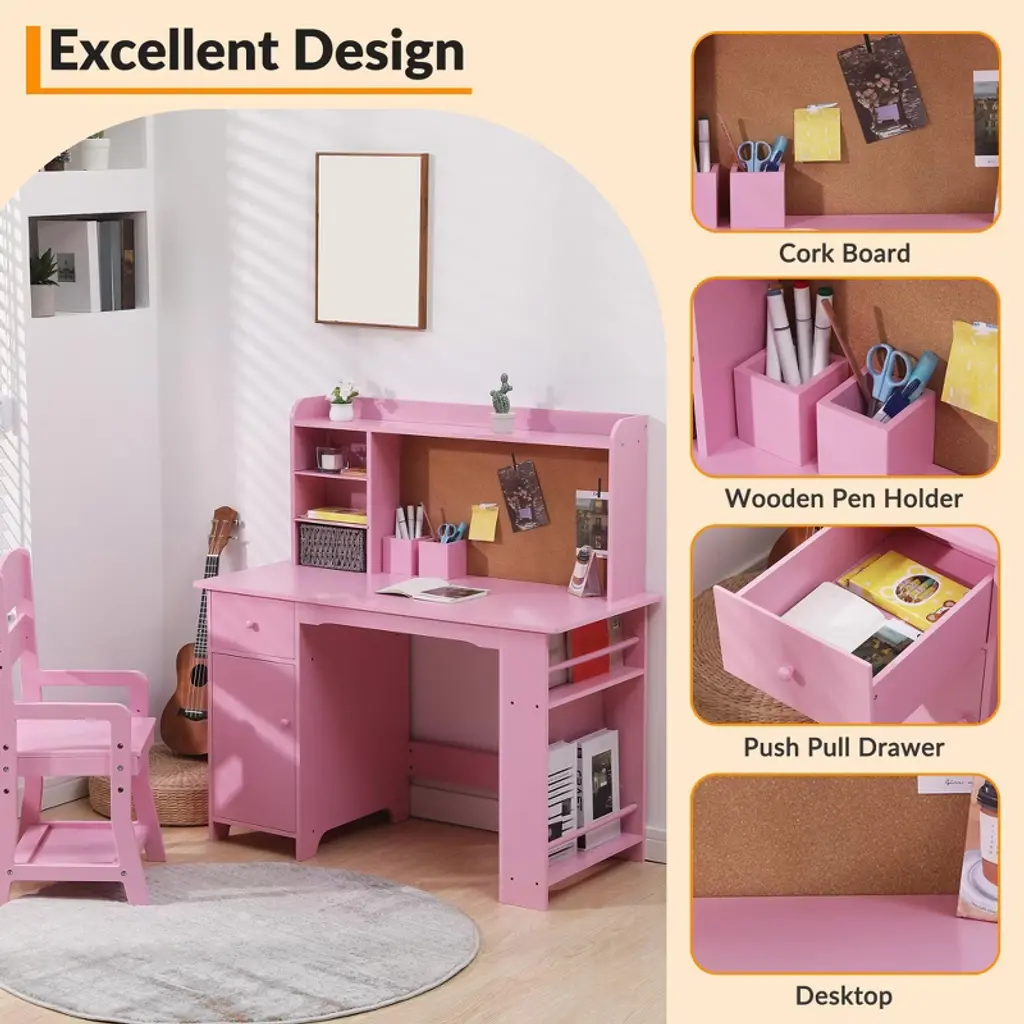 Gustowave Study Desk And Chair Set For Children, Study Table For Kids - Features Bookshelf, Bulletin Board, Cabinets And Drawer, Pink