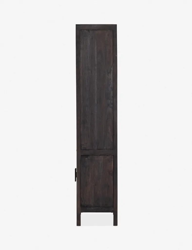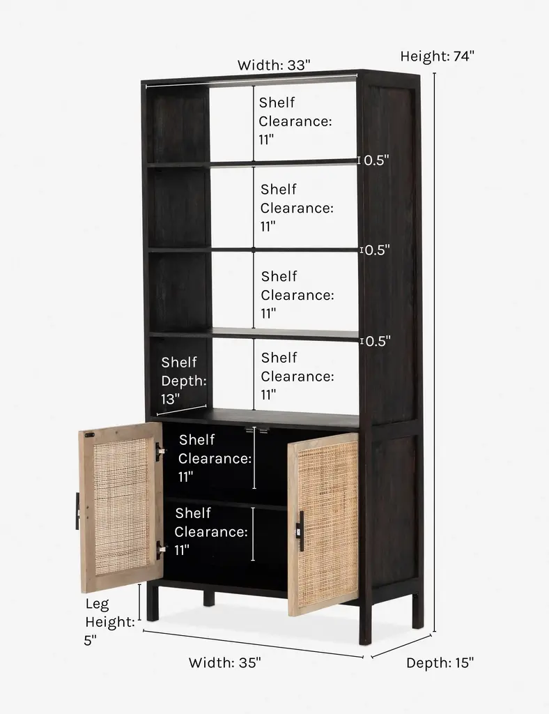 Thoughtfully designed with textural elements done in a high contrast palette, this bookcase also offers multiple open shelves perfect for storage and display. The black acacia wood gives a cool, modern look, while woven cane doors bring a touch of warmth. Don't overlook the ample hidden storage behind those beautiful doors.