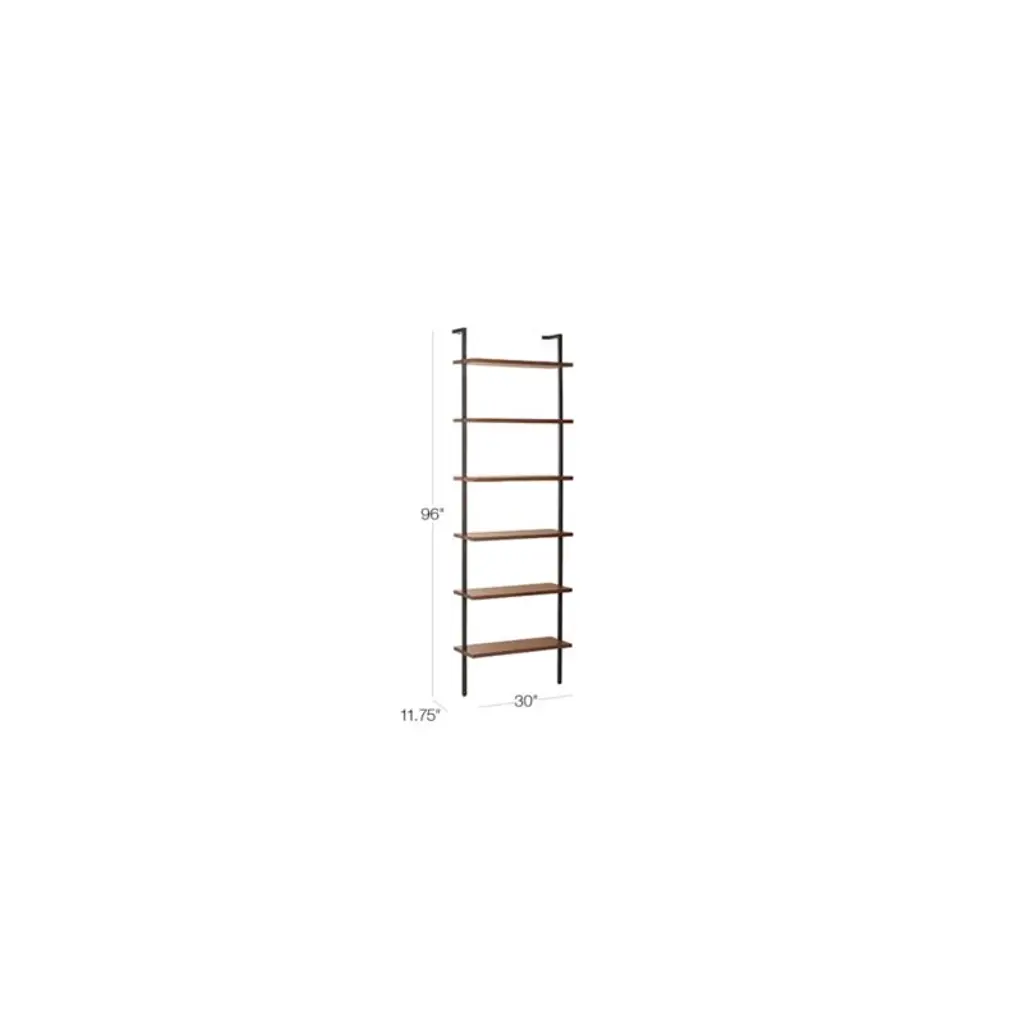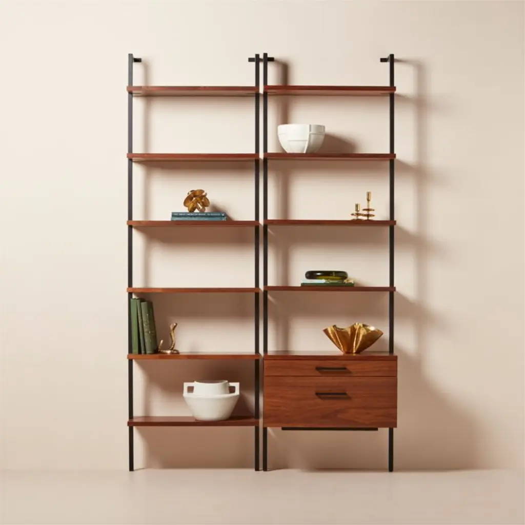 Fresh feels for a cult favorite. Six shelves in rich walnut veneer are fixed to powdercoated metal frames and stand stacked to heights of 96". Modularly designed to save space and repeat dramatically down the wall, with a vibe that plays nicely alongside our Helix walnut desk. Stud mounting recommended; hardware included for drywall installation. CB2 exclusive.