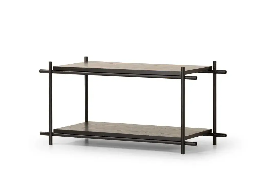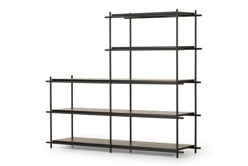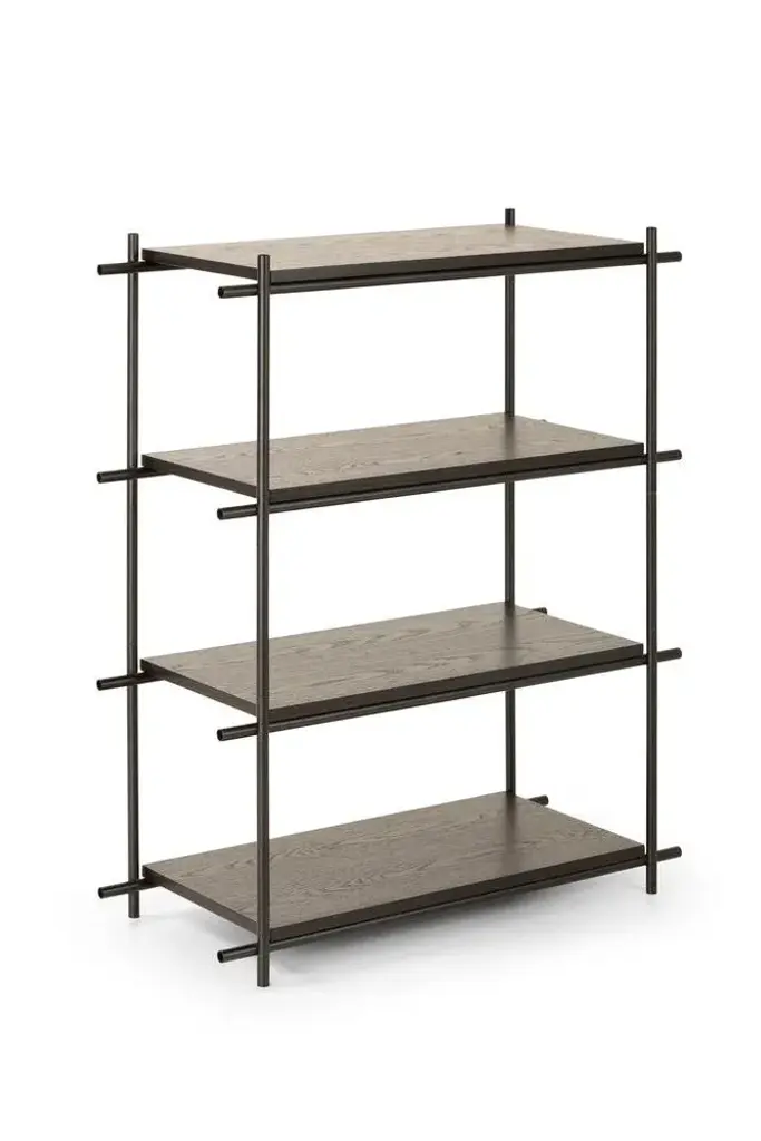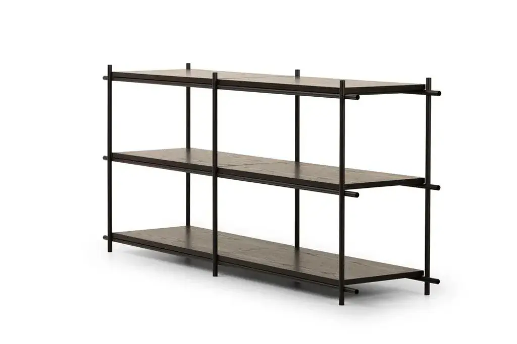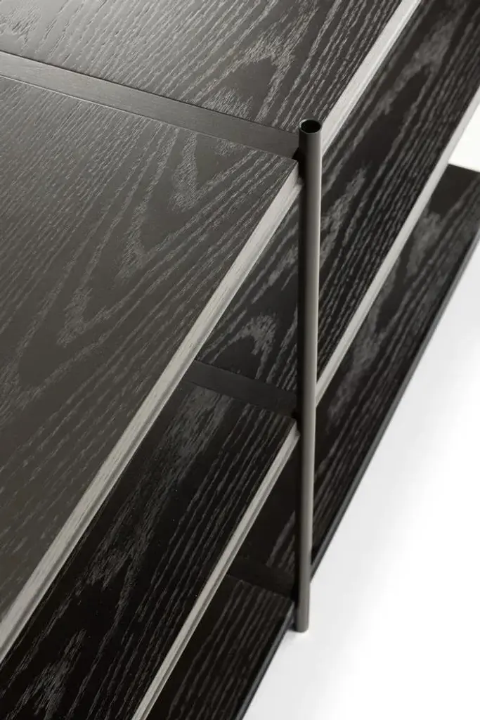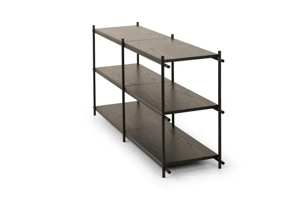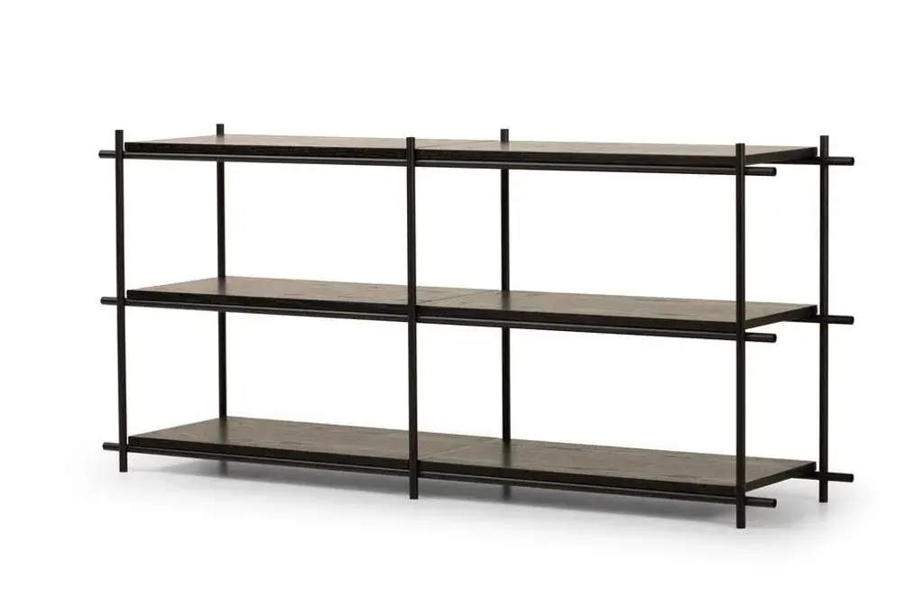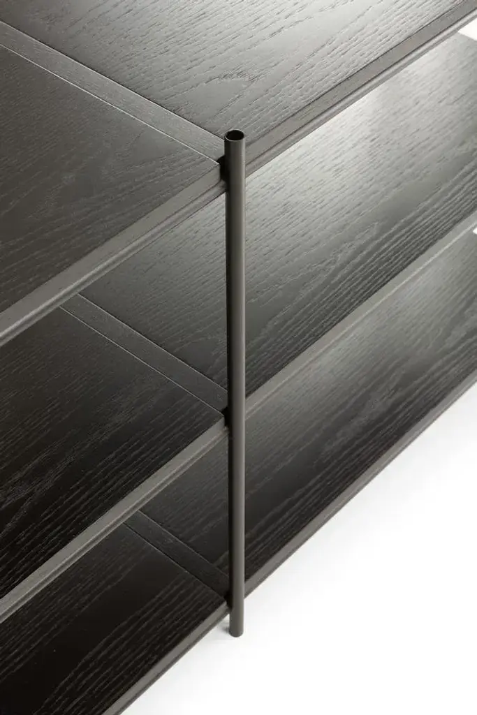 Innocent Bookshelf Four Modules by Mingardo Dimensions: D166 x W39 x H76cm Materials: RAL 9005 black varnished iron structure, shelf in black stained oak Weight: 85 kg Also Available in different dimensions. The Innocent project is inspired by the industrial systems of metal joints and pipes, and emphasizes the relationship between the simplicity of shapes and Mingardo’s craftsmanship excellence. The Innocent modular system consists of shelving tops in black painted oak, connected by a tubular black-colored structure. The system allows the creation of different furnishing elements, from low tables to consoles to bookcases of various heights.