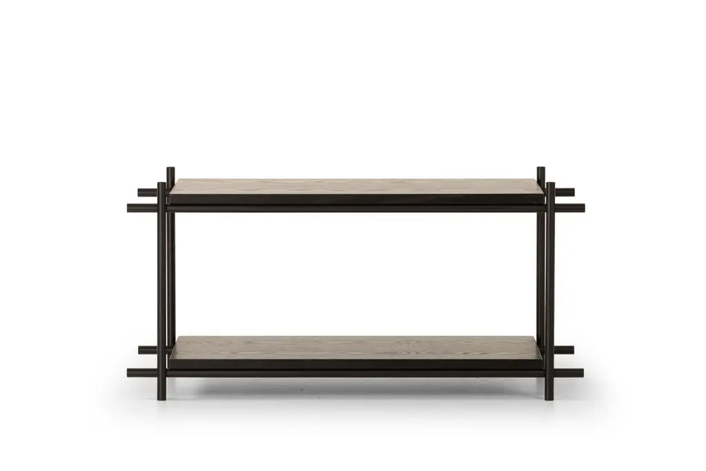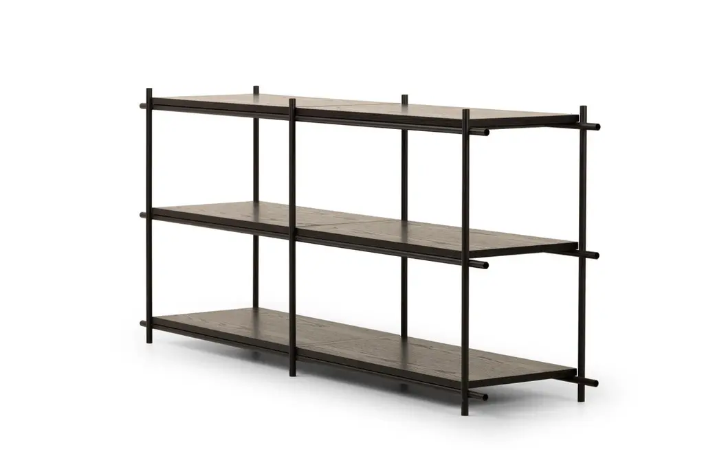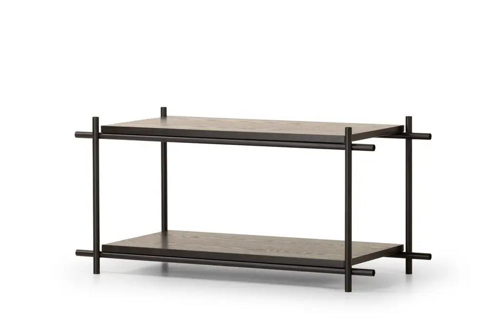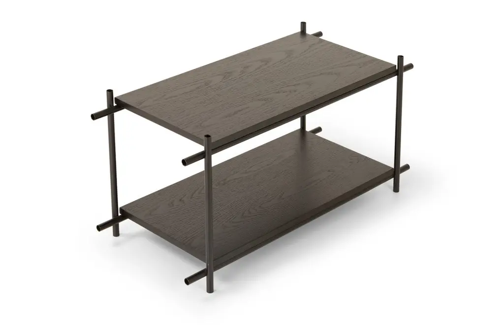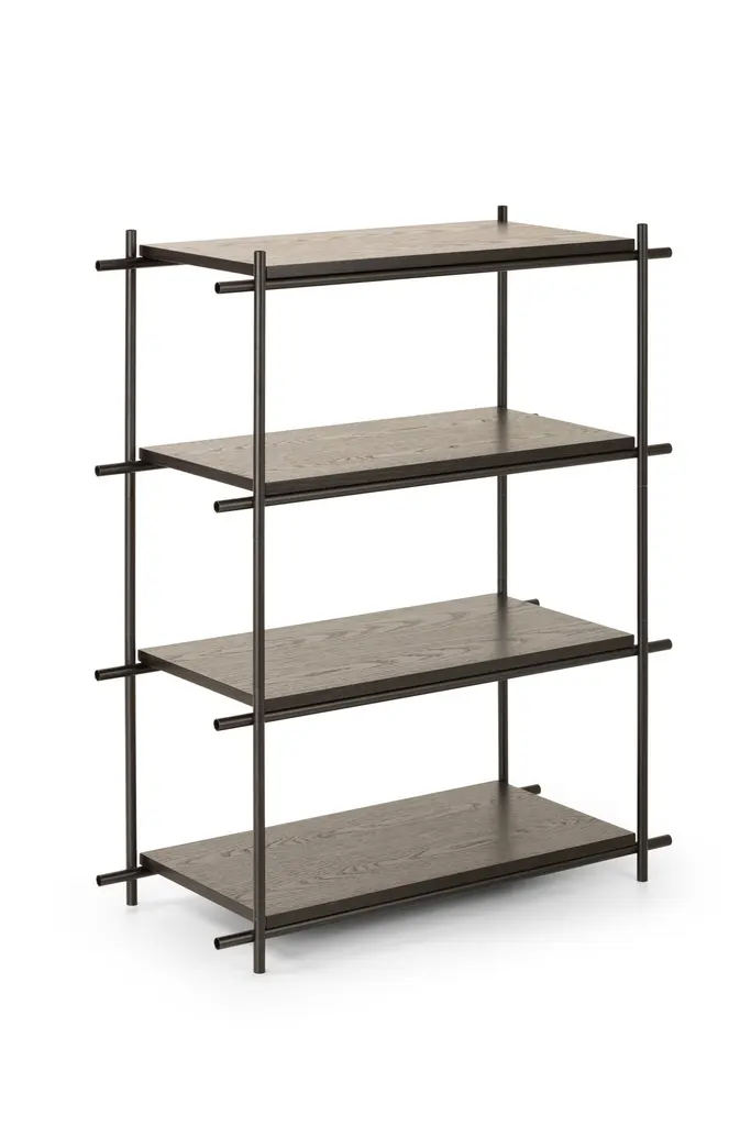 Innocent bookshelf single module by MingardoDimensions: D90 x W39 x H43 cm Materials: RAL 9005 black varnished iron structure, shelf in black stained oakWeight: 30 kgAlso available in different dimensions. The Innocent project is inspired by the industrial systems of metal joints and pipes, and emphasizes the relationship between the simplicity of shapes and Mingardo’s craftsmanship excellence. The Innocent modular system consists of shelving tops in black painted oak, connected by a tubular black-colored structure. The system allows the creation of different furnishing elements, from low tables to consoles to bookcases of various heights.Mingardo Ilario founded Mingardo Blacksmith Workshop in 1970, after over twenty years’ experience in the metal processing field.The production was initially focused on simple blacksmith works for the construction industry. Over the time, it has become more refined, enabling the company to collaborate with internationally renowned companies and architects: from the first collaborations with architect Carlo Scarpa to the more recent commissions for Museo del Novecento in Milan, Parco della Musica in Florence, and Teatro Petruzzelli in Bari.Over the years, the Workshop has achieved great results, with the production of unique metal products, all hand-wrought by a highly skilled team of specialized artisans. Nowadays, it is highly regarded in the local artisan field for its high-end refined finishing touches and details, and for its know-how.