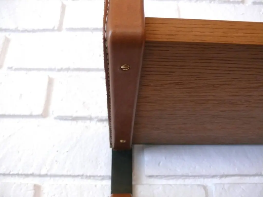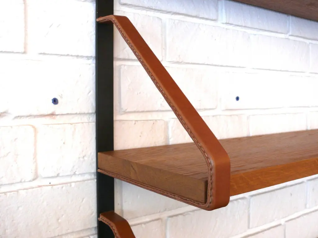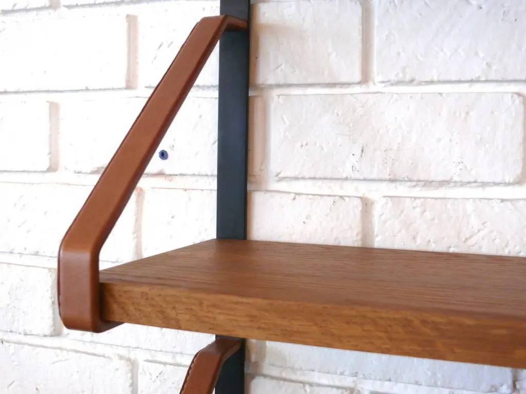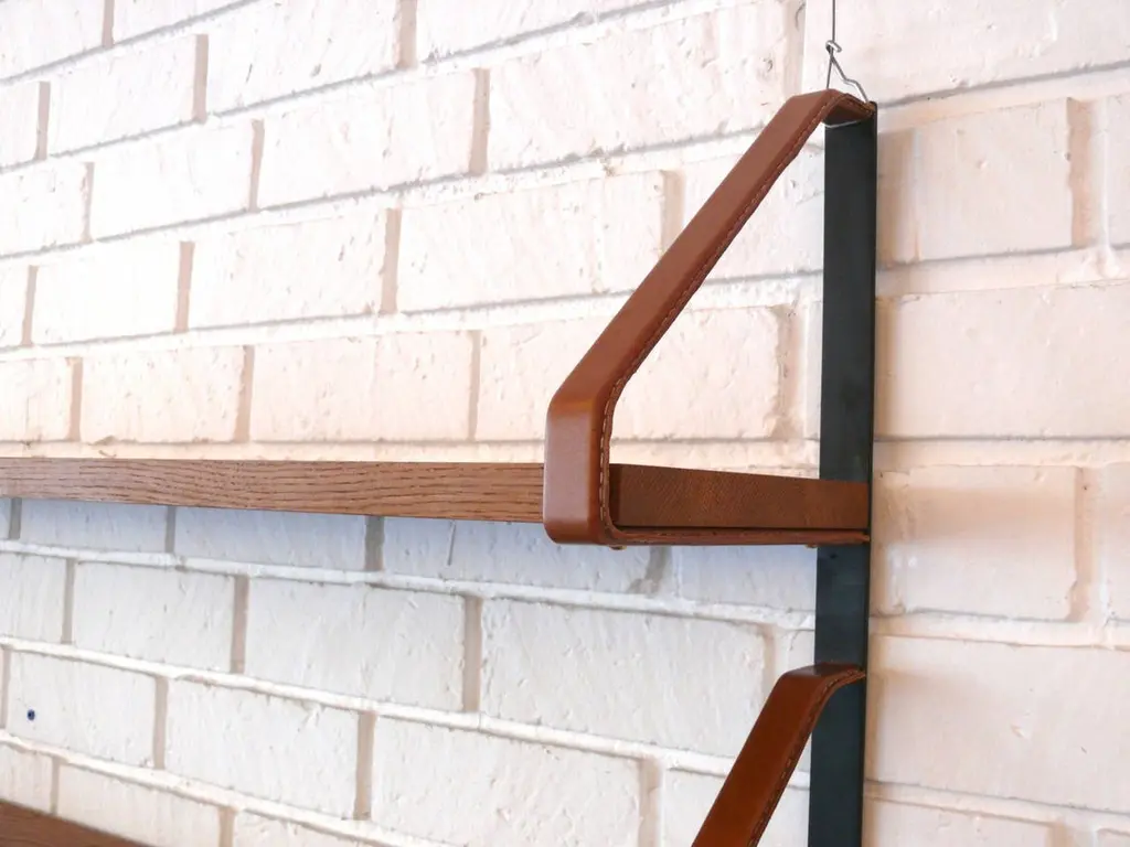 Handsome oak and leather bookshelf in the style of Jacques Adnet. Newly produced after a vintage Adnet bookshelf. Custom iron frame with saddle leather wrapped brackets and signature contrast stitching. 3/4" thick oak shelves and brass hardware. Very versatile piece. Custom sizes available.