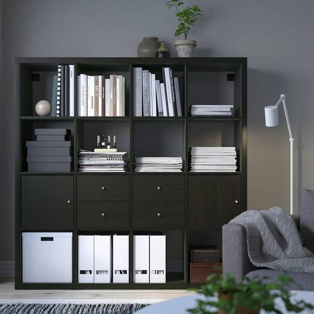 KALLAX Shelf unit with 4 inserts - black-brown 57 7/8x57 5/8 ". The simple design with clean lines makes KALLAX flexible and easy to use at home. You can use this shelving unit as a room divider to create a room within a room while enjoying plenty of storage.