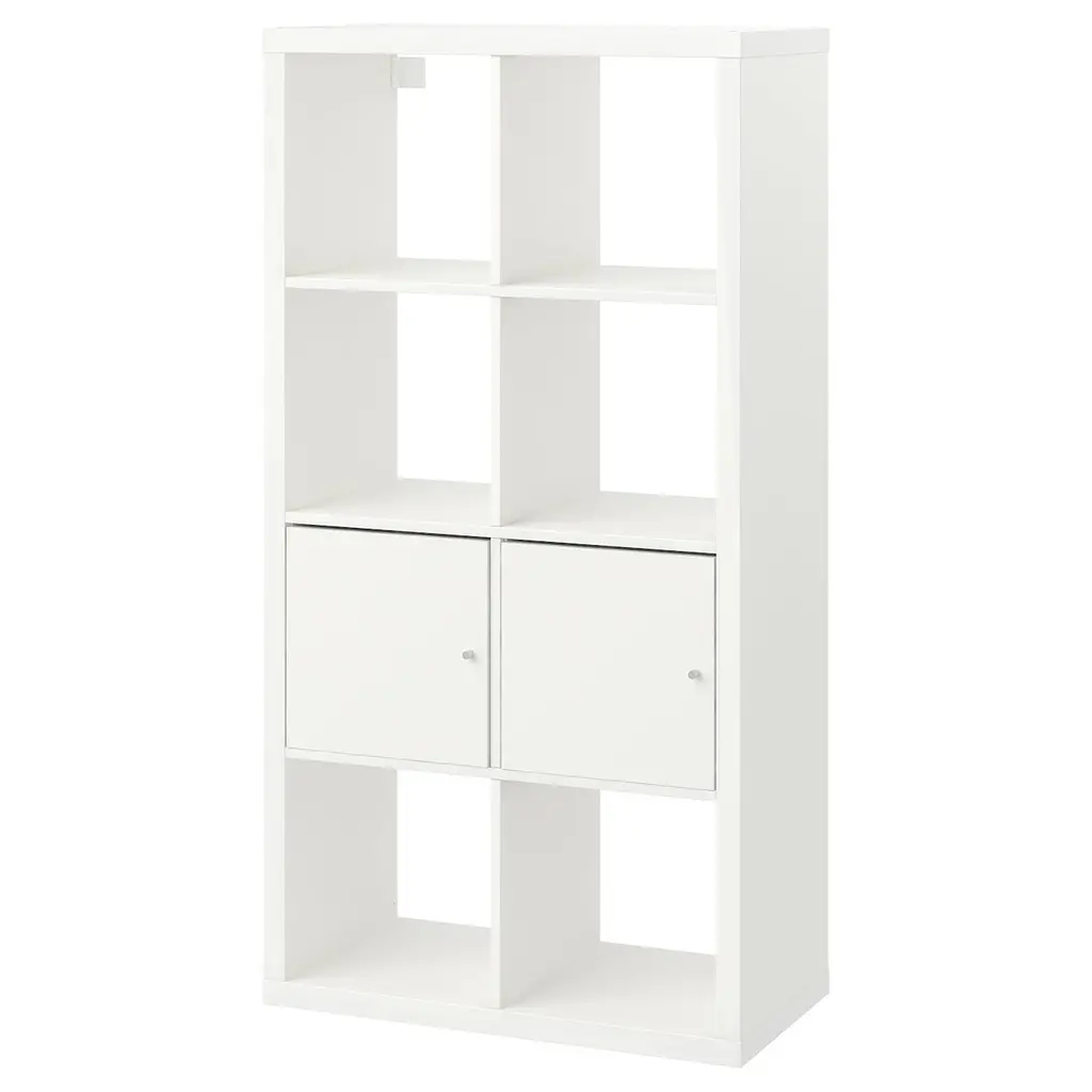 KALLAX Shelf unit with doors - high-gloss/white 30 1/8x57 5/8 ". Choose whether you want to place it vertically or horizontally to use it as a shelf or sideboard. You can use inserts to customize the KALLAX shelving unit so that it suits your storage needs.