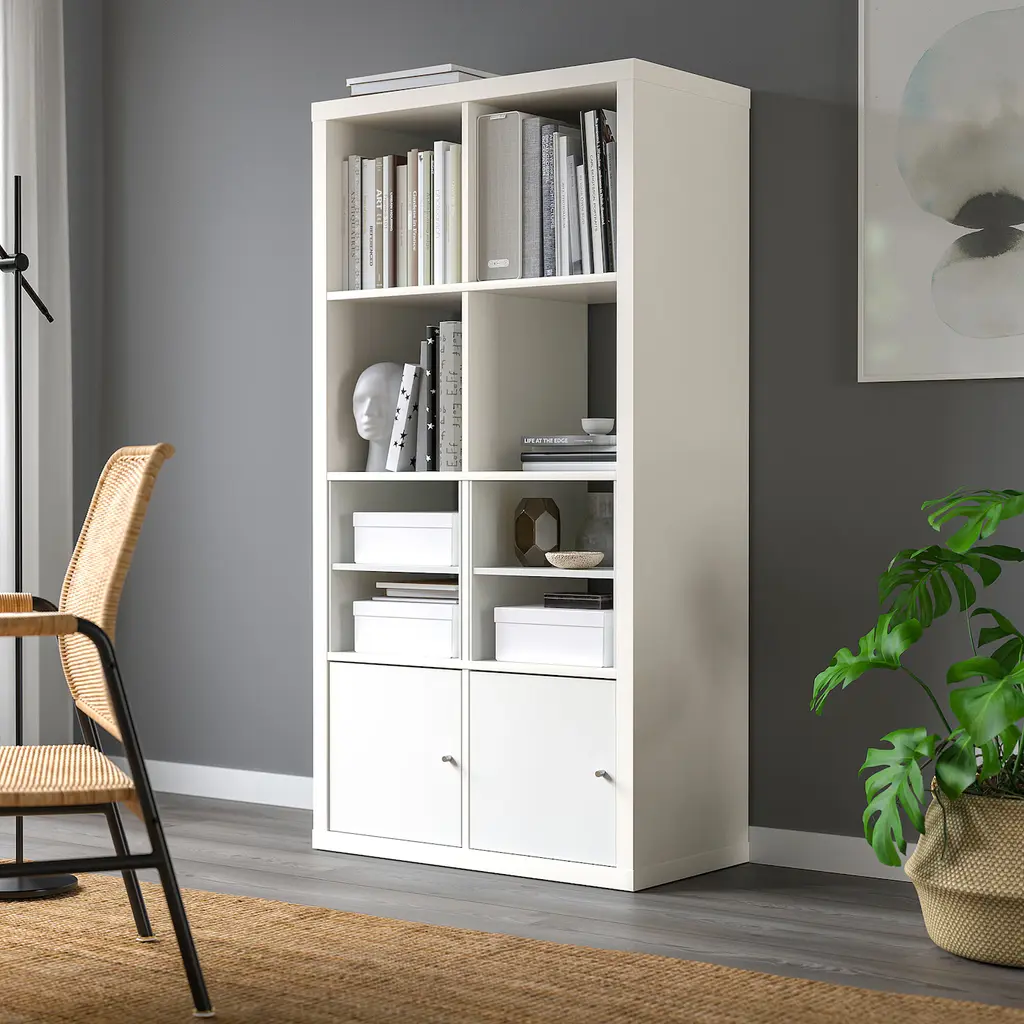 KALLAX Shelving unit - with 2 doors/with 2 shelf inserts white 57 5/8x30 1/8 ". The practical inserts hide things and help maintain a clean and tidy look. This furniture must be secured to the wall with the enclosed wall anchoring device.
