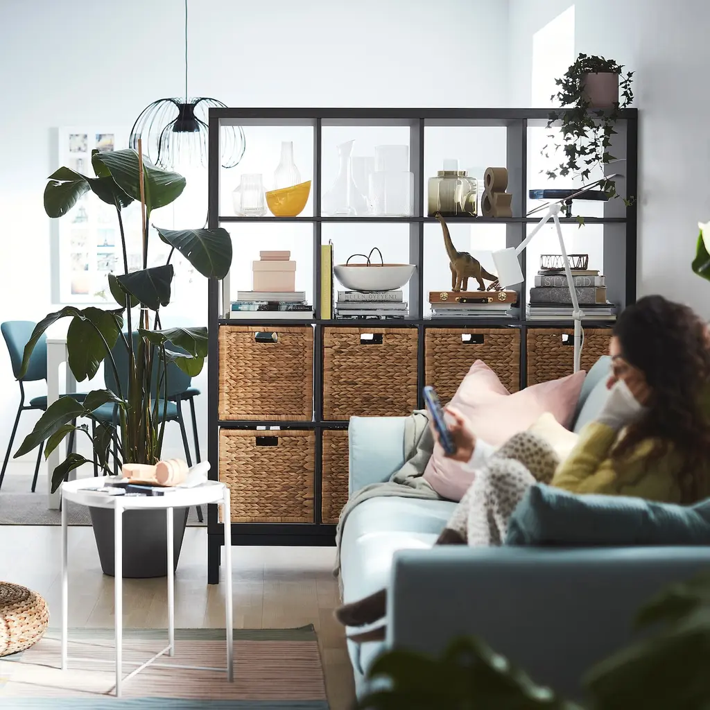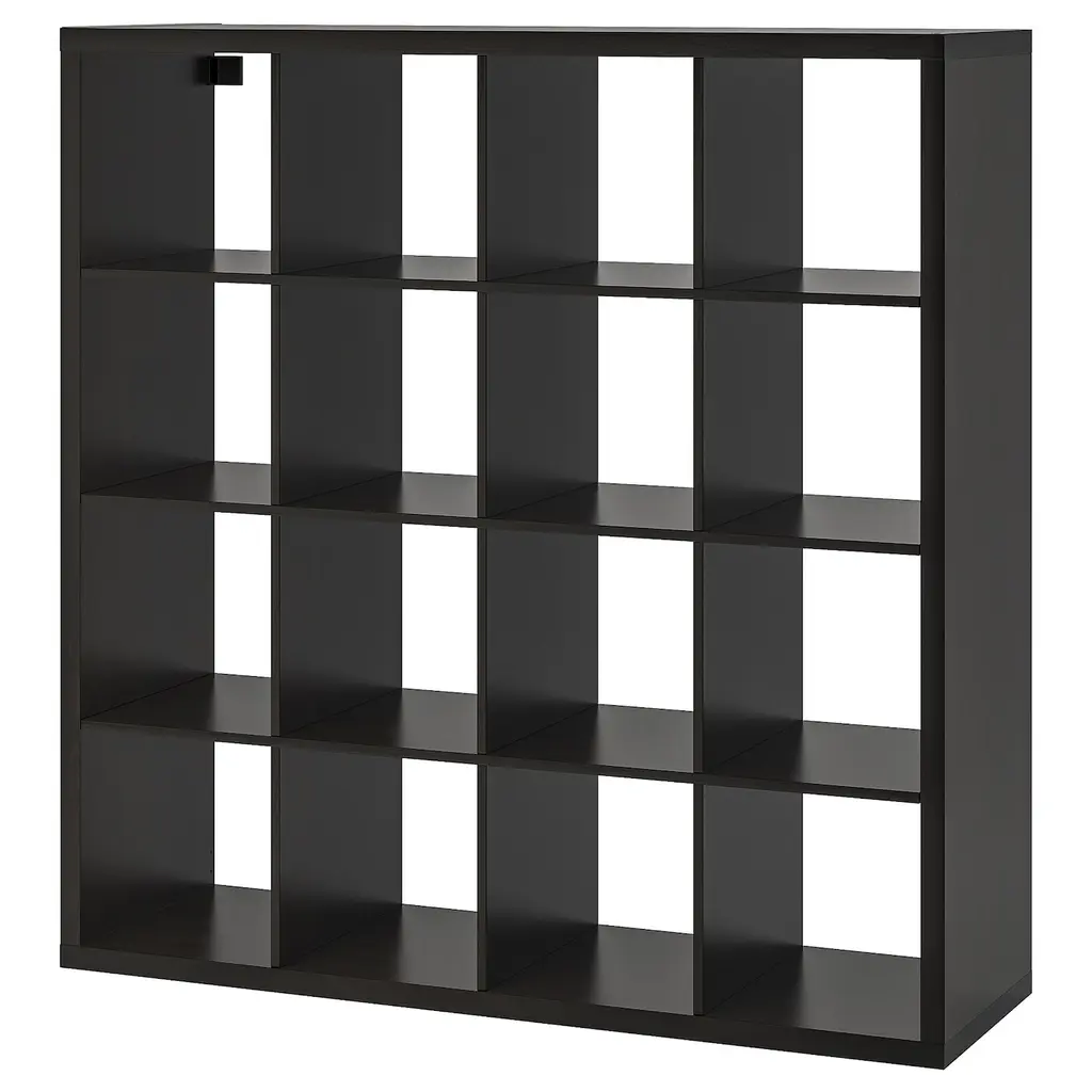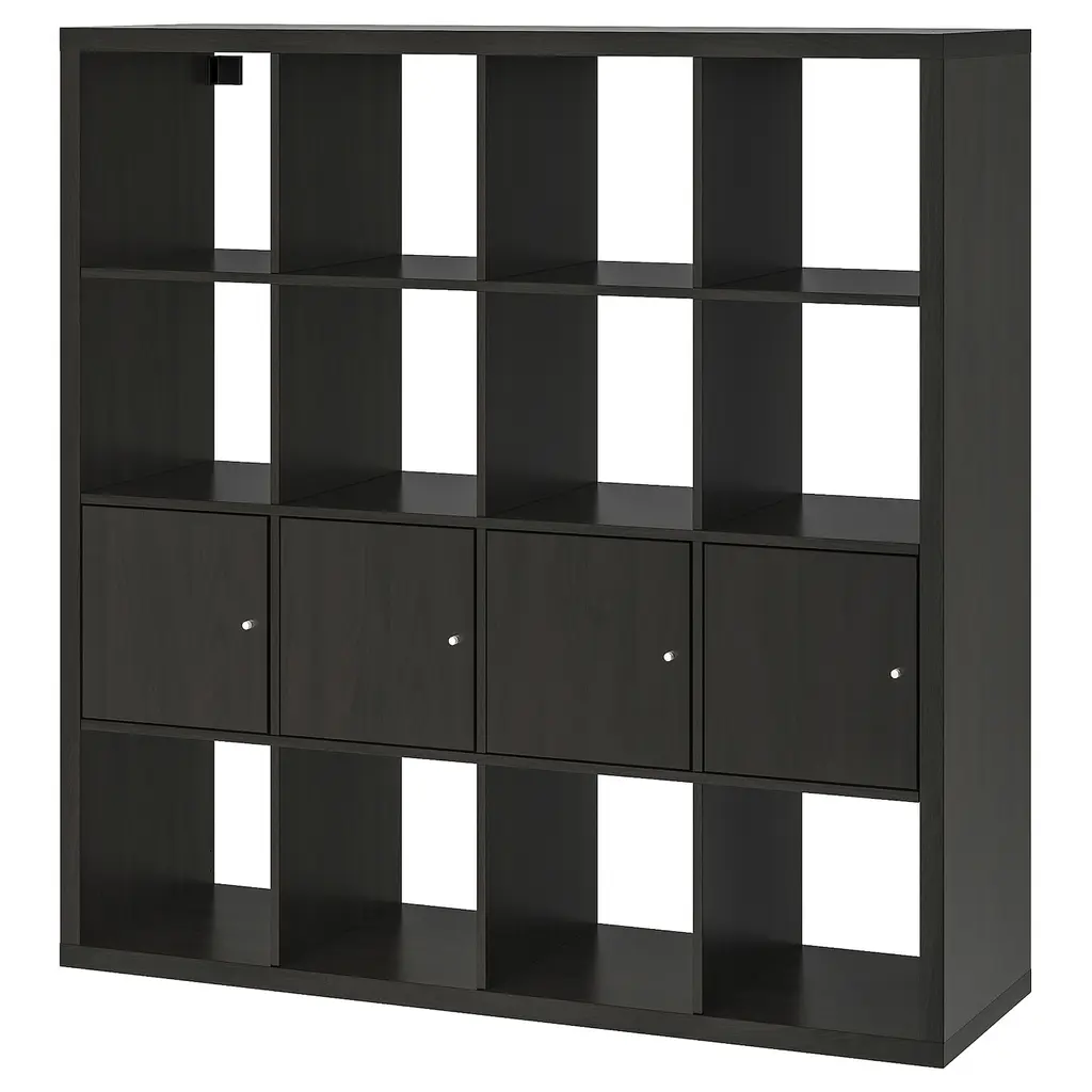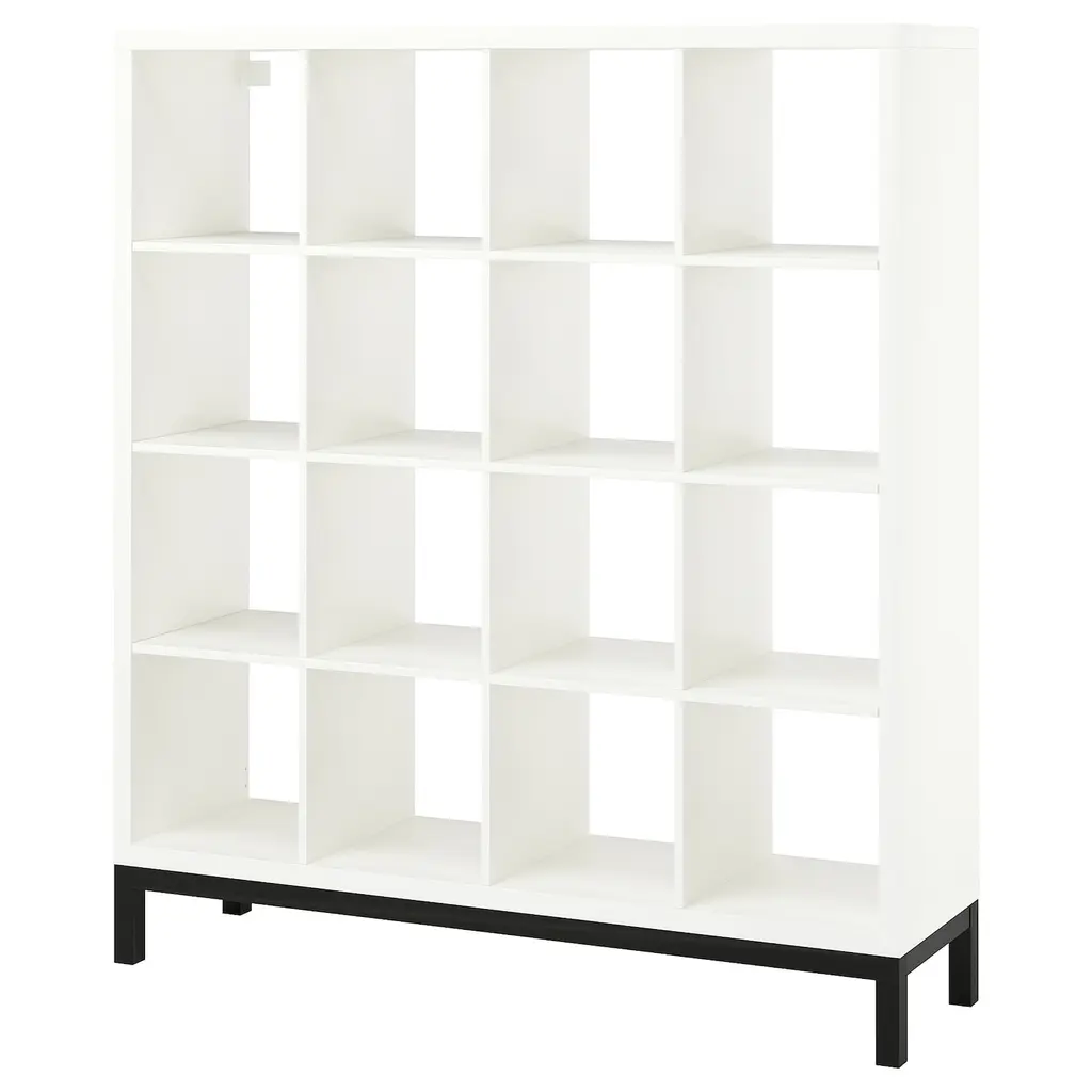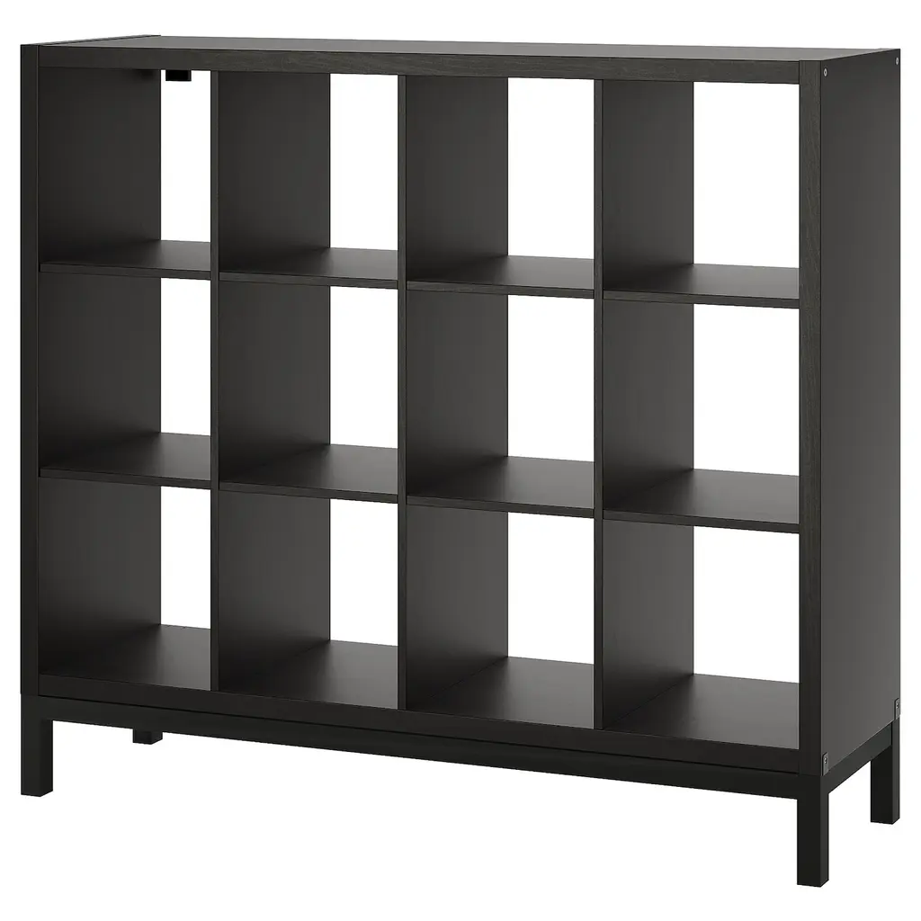 KALLAX Shelving unit with underframe - black-brown/black 57 7/8x64 5/8 ". The underframe gives the shelving unit an airy and elegant look while making it easier to vacuum under it. You can use this shelving unit as a room divider to create a room within a room while enjoying plenty of storage.