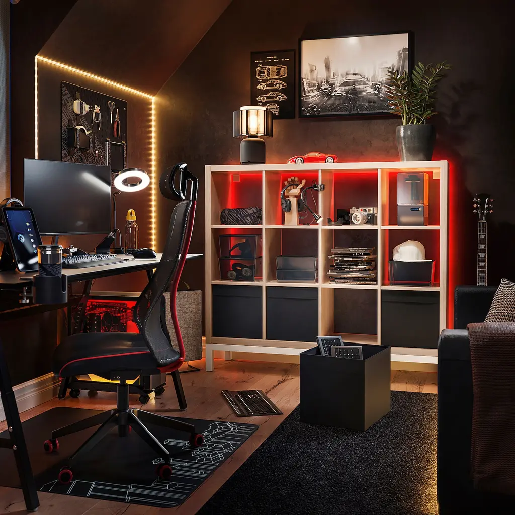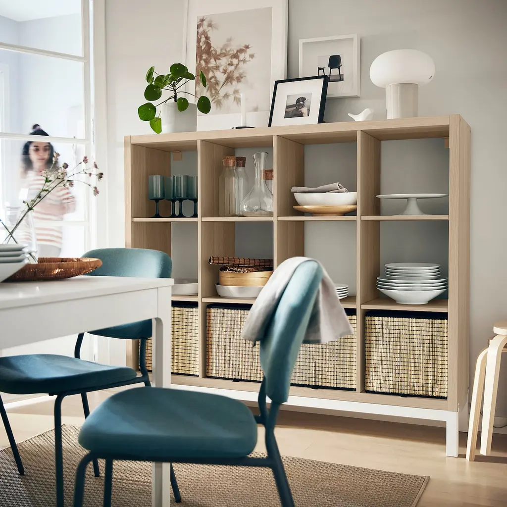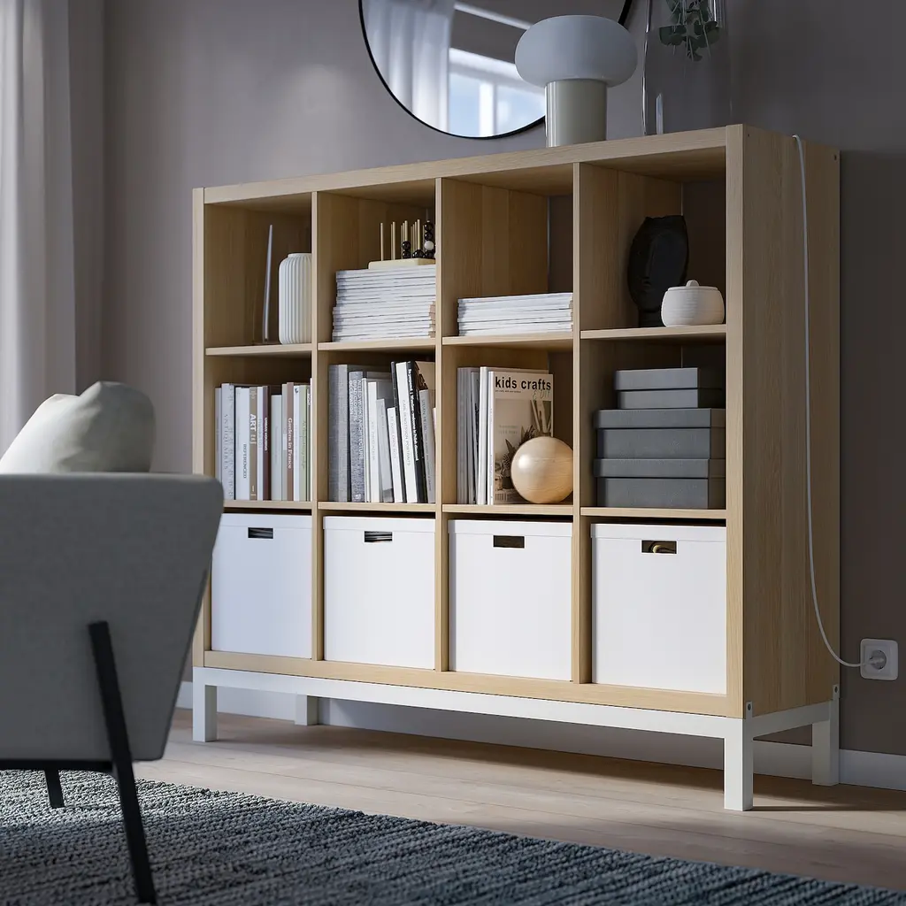 KALLAX Shelving unit with underframe - white stained oak effect/white 57 7/8x50 3/4 ". The underframe gives the shelving unit an airy and elegant look while making it easier to vacuum under it. The simple design with clean lines makes KALLAX flexible and easy to use at home.