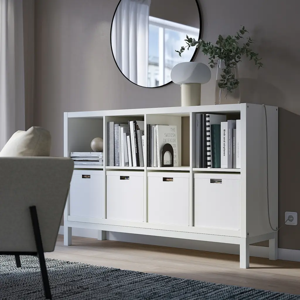 KALLAX Shelving unit with underframe - white/white 57 7/8x37 ". The underframe gives the shelving unit an airy and elegant look while making it easier to vacuum under it. The simple design with clean lines makes KALLAX flexible and easy to use at home.