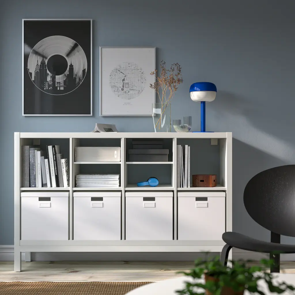 KALLAX Shelving unit with underframe - with 2 shelf inserts/white 57 7/8x37 ". You can use inserts to customize the KALLAX shelving unit so that it suits your storage needs. The underframe gives the shelving unit an airy and elegant look while making it easier to vacuum under it.